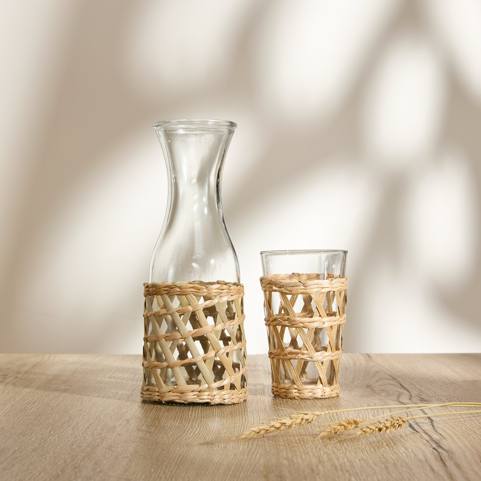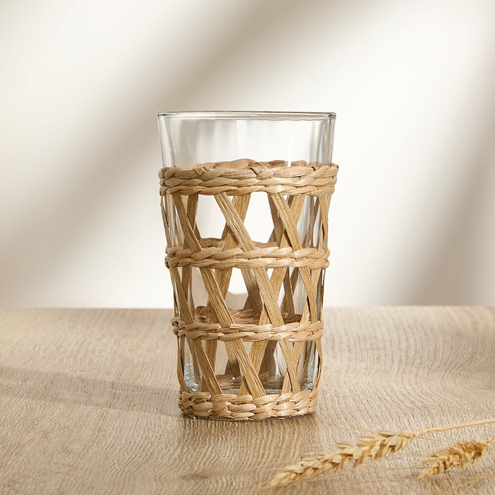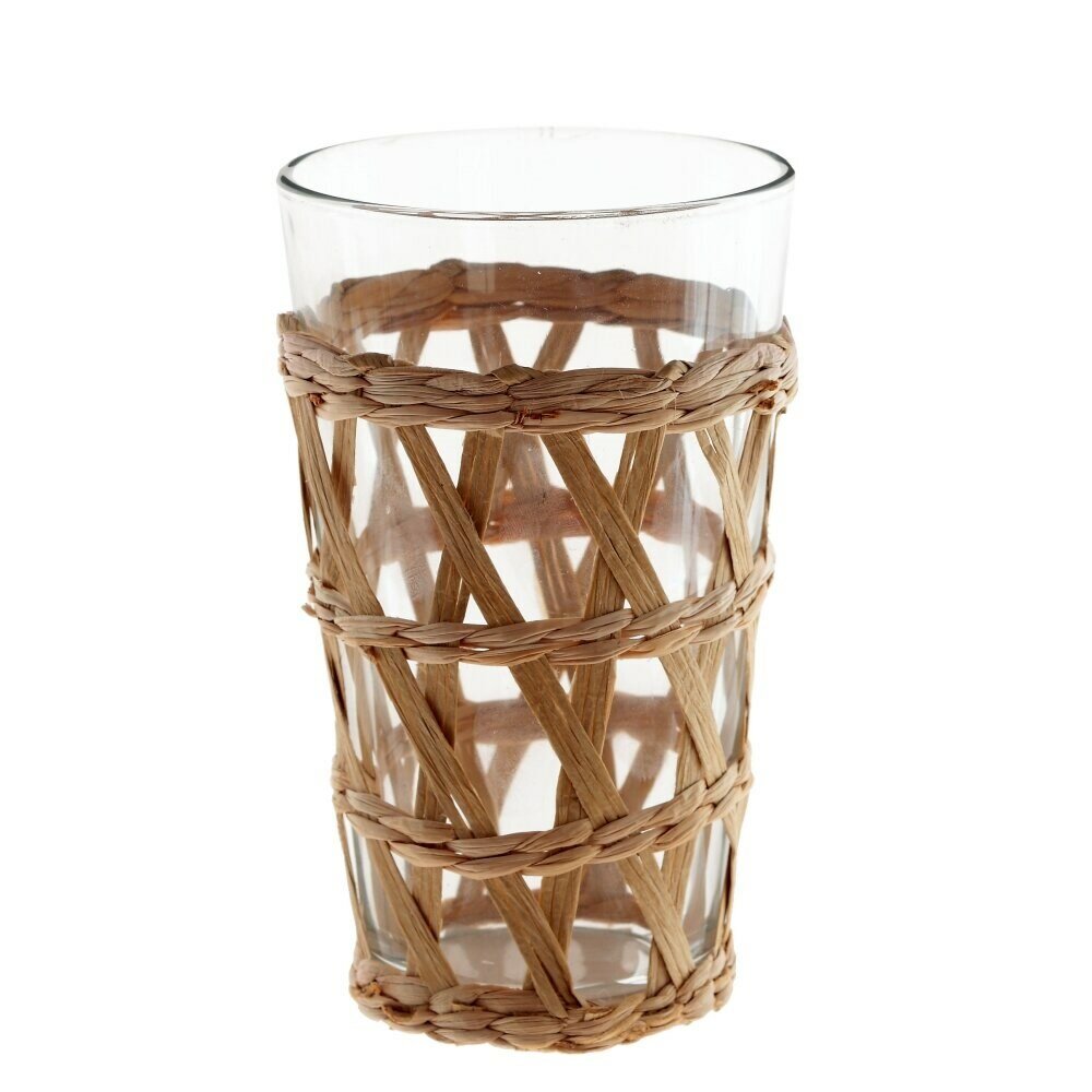 Стеклянная ваза в форме стакана с плетеным соломенным декором. Она сочетает в себе прочность и прозрачность стекла с естественной красотой и теплотой соломы. Может быть использована для цветов, веток, зелени, а так же как отдельный элемент декора. Диаметрт горлышка: 8 см.
