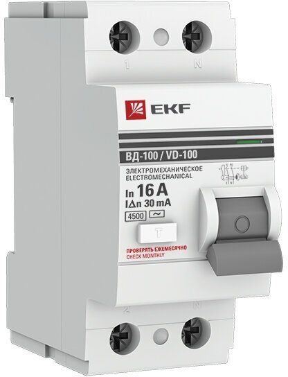 **УЗО EKF ВД-100 AC** используется для установки в электрическом щитке жилого помещения. Защищает человека и животных от случайного поражения током. При сильном перепаде силы тока осуществляет отключение напряжения. Корпус изготовлен из прочного пластика. Имеется тумблер для включения устройства.
