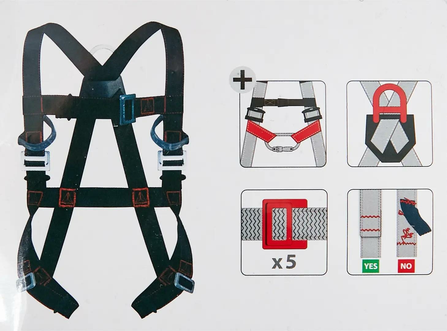 Привязь с 2 точками крепления для защиты от падений (спинная, грудная), с грудной лямкой. Материал ремней – полиэстер. Регулировка привязи осуществляется с помощью 2 пряжек на ножных лямках, 2 пряжек на плечевых лямках и пряжки на грудной лямке. Индикатор падения. Испытана на 150 кг.