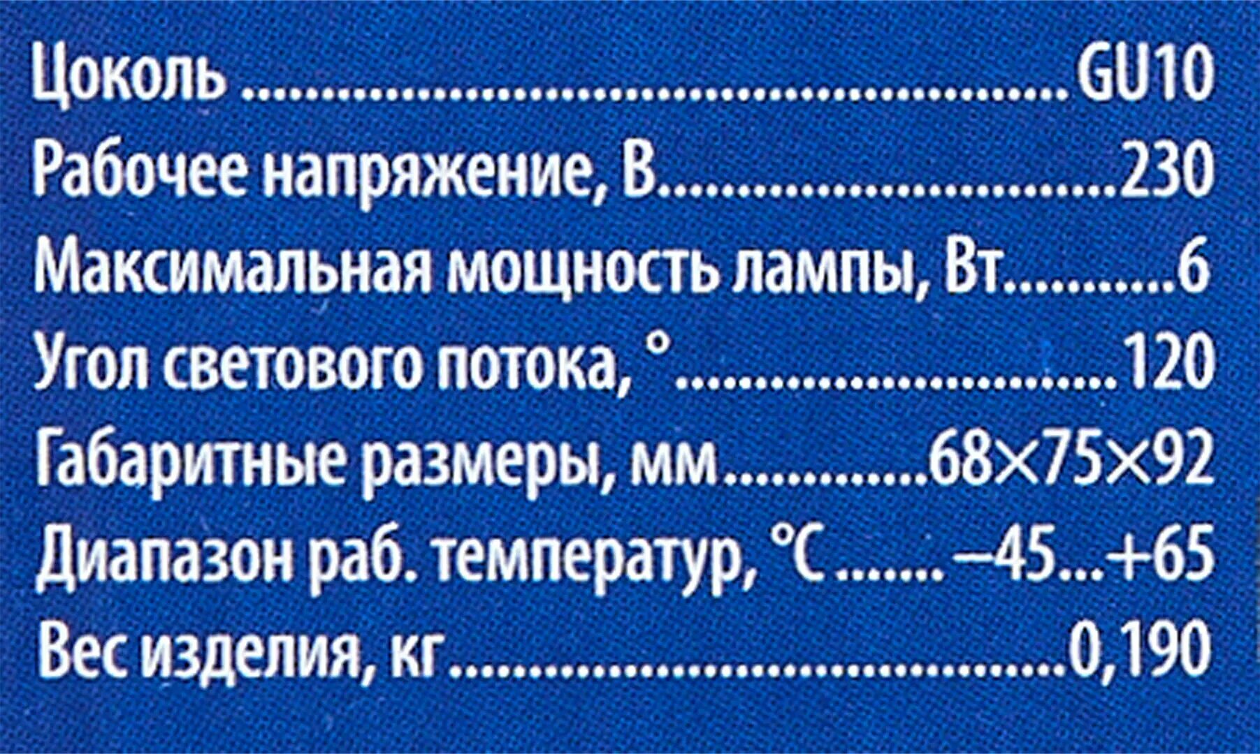 | Максимально допустимая мощность лампы (Вт) | 6 |