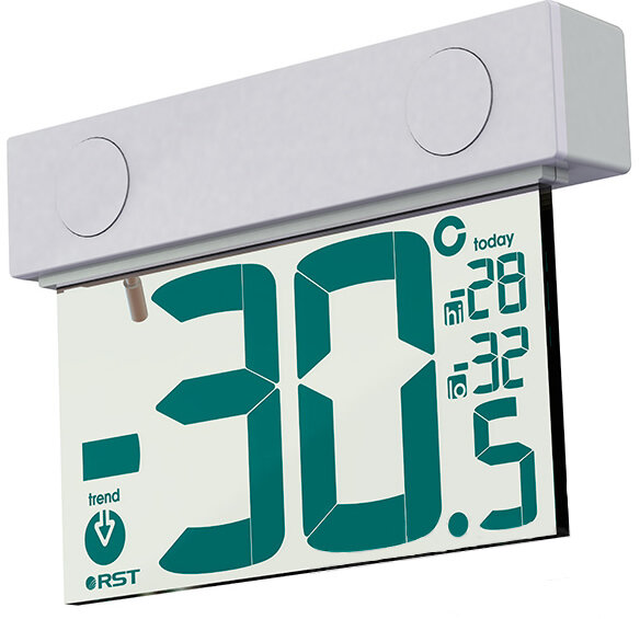 Современная оригинальная модель уличного термометра с прозрачным дисплеем. Цифровой термометр уличный RST измеряет температуру в интервале от -30 до 70. Прибор оснащен большим ЖК-дисплеем, на котором крупными цифрами выводятся показания, а также специальным светоотражающим матовым фильтром, который предназначен для лучшей видимости в ночное время.