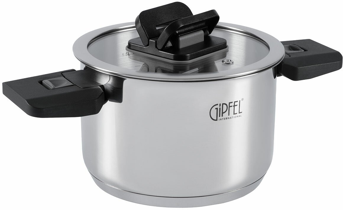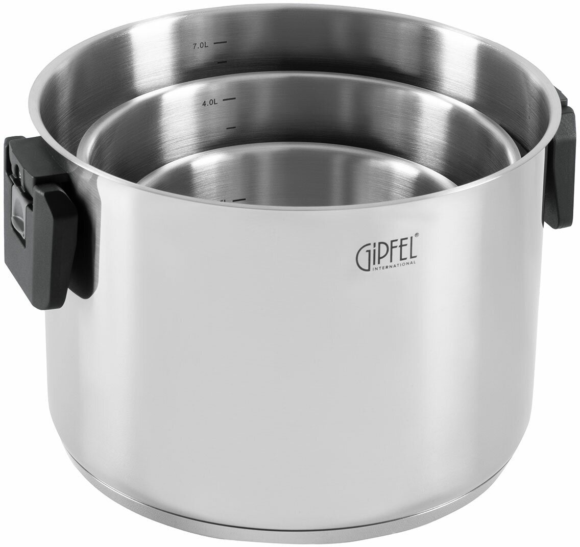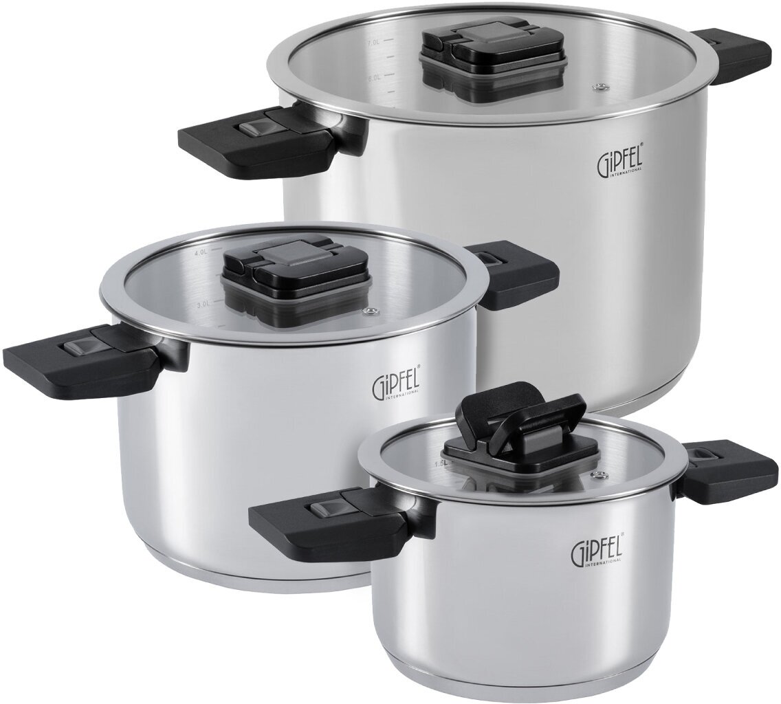 Набор посуды Gipfel Compact 51812 включает 6 предметов: кастрюля 1,8 л размером 16х10,5 см, кастрюля 4 л размером 20х14 см, кастрюля 7 л размером 24х17,5 см и 3 стеклянные крышки соответствующих диаметров.
