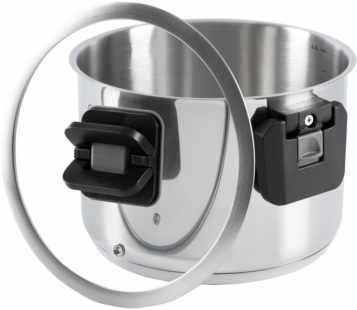 Кастрюли изготовлены из нержавеющей стали 18/10 с толщиной стенок: 0,6 мм. На внутренней стенке каждой кастрюли нанесена мерная шкала: в маленькой от 0,5 до 1,5 л, в средней от 1 до 4 л и в большой от 2 до 7 л. Внешняя сторона кастрюль с зеркальной шлифовкой, внутренняя отшлифована с щеточной текстурой. Ручки на корпусе кастрюль не нагреваются и могут складываться посредством нажатия на серые встроенные клавиши в ручки.
