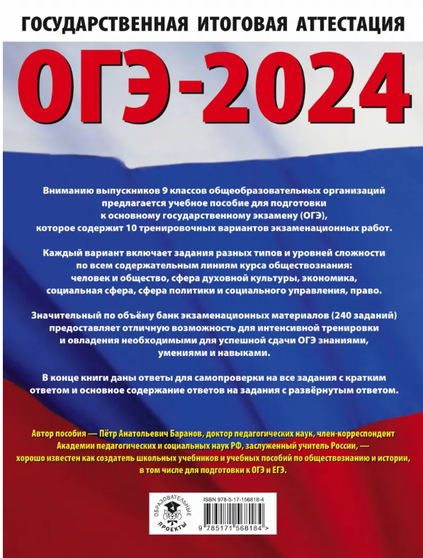 ОГЭ-2024. Обществознание (60x84/8). 10 тренировочных вариантов экзаменационных работ для подготовки к основному государственному экзамену (П. А. Баранов); Издательство АСТ, 2023