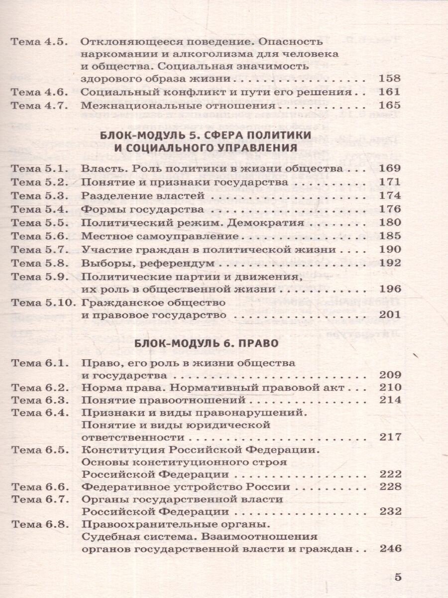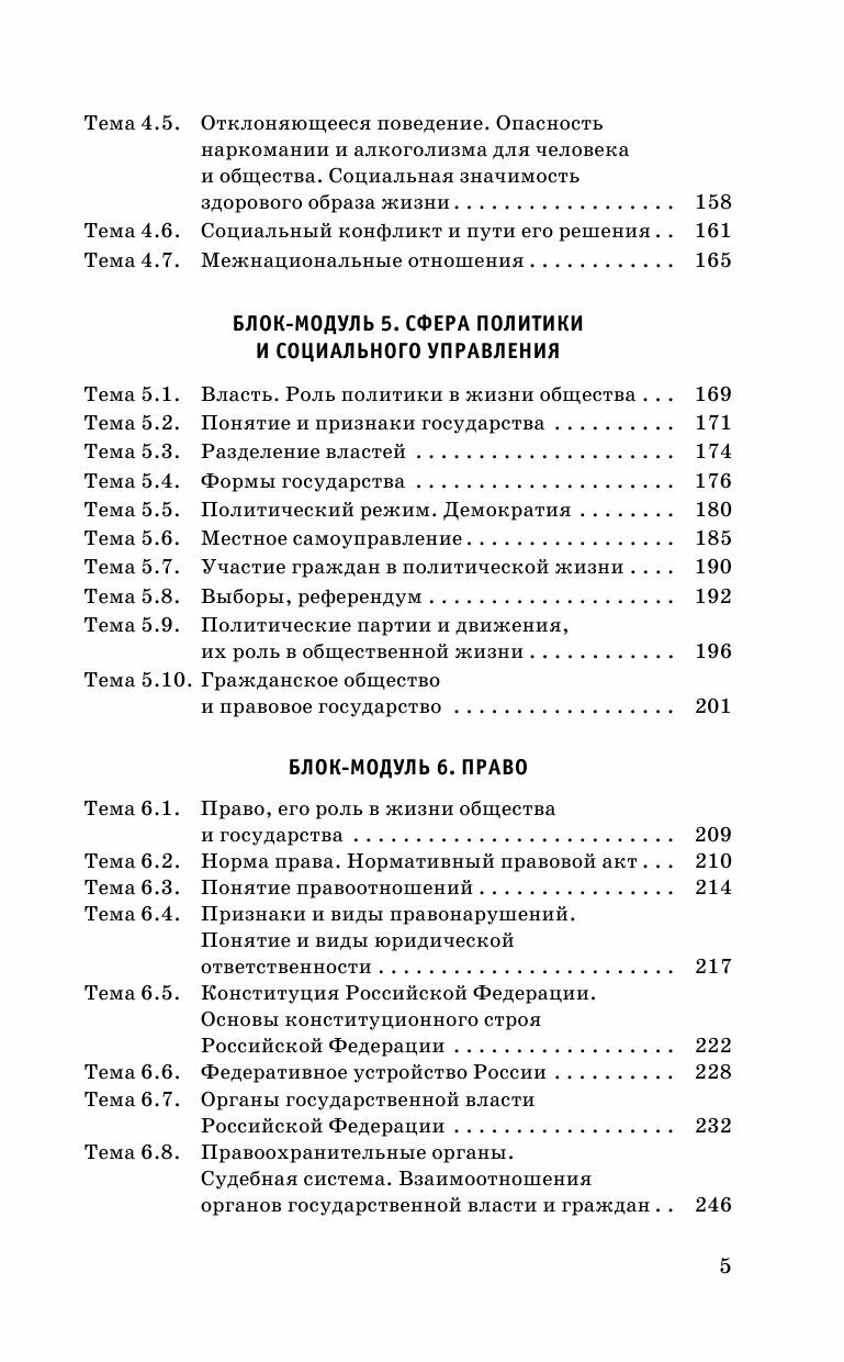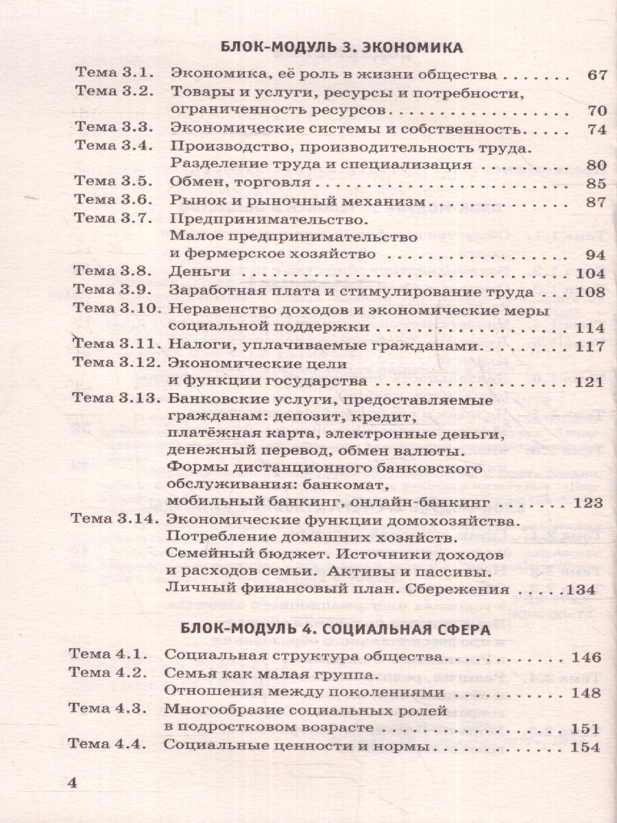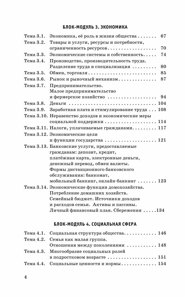 Содержательные линии курса сгруппированы в шесть блоков-модулей: «Человек и общество», «Сфера духовной культуры», «Экономика», «Социальная сфера», «Сфера политики и социального управления», «Право».