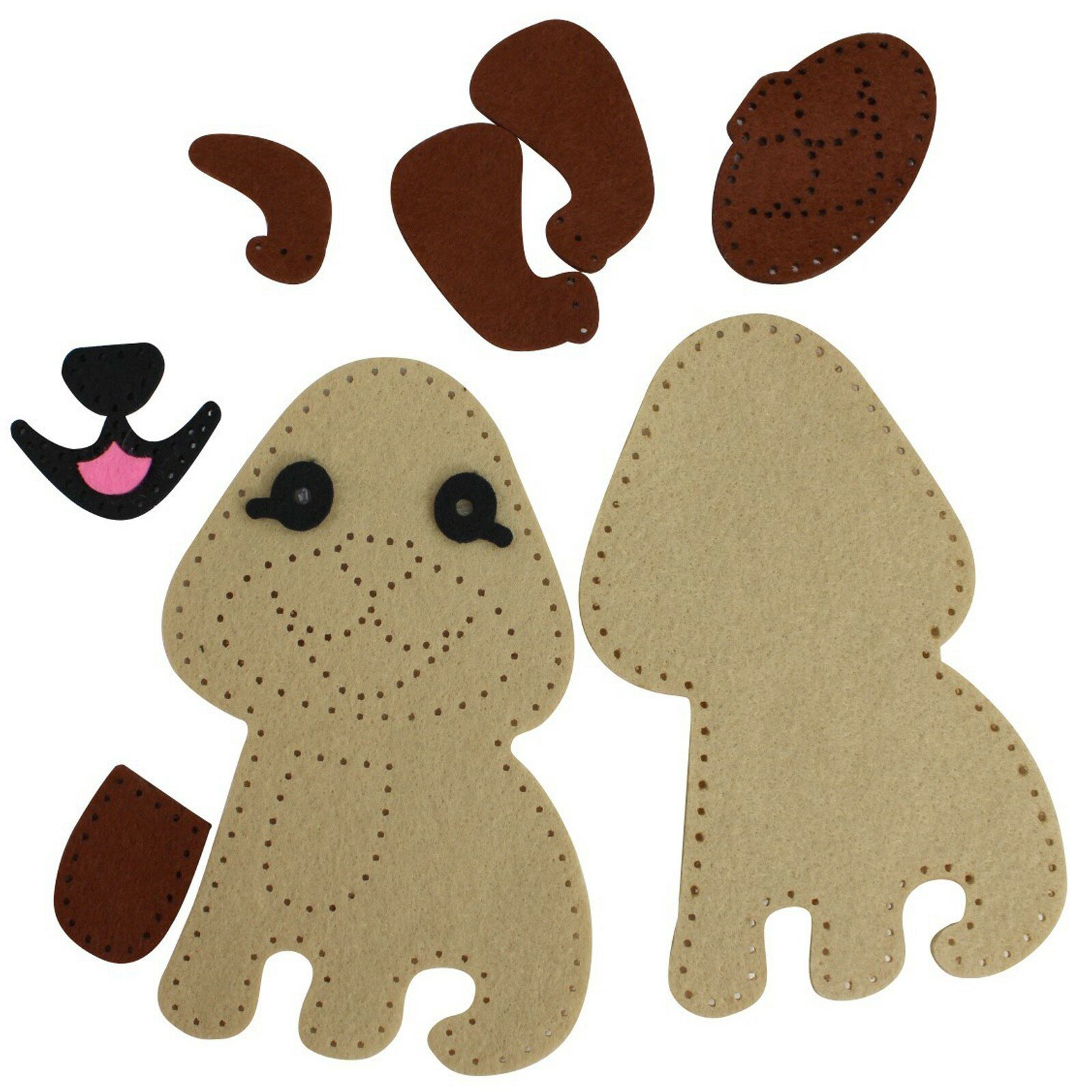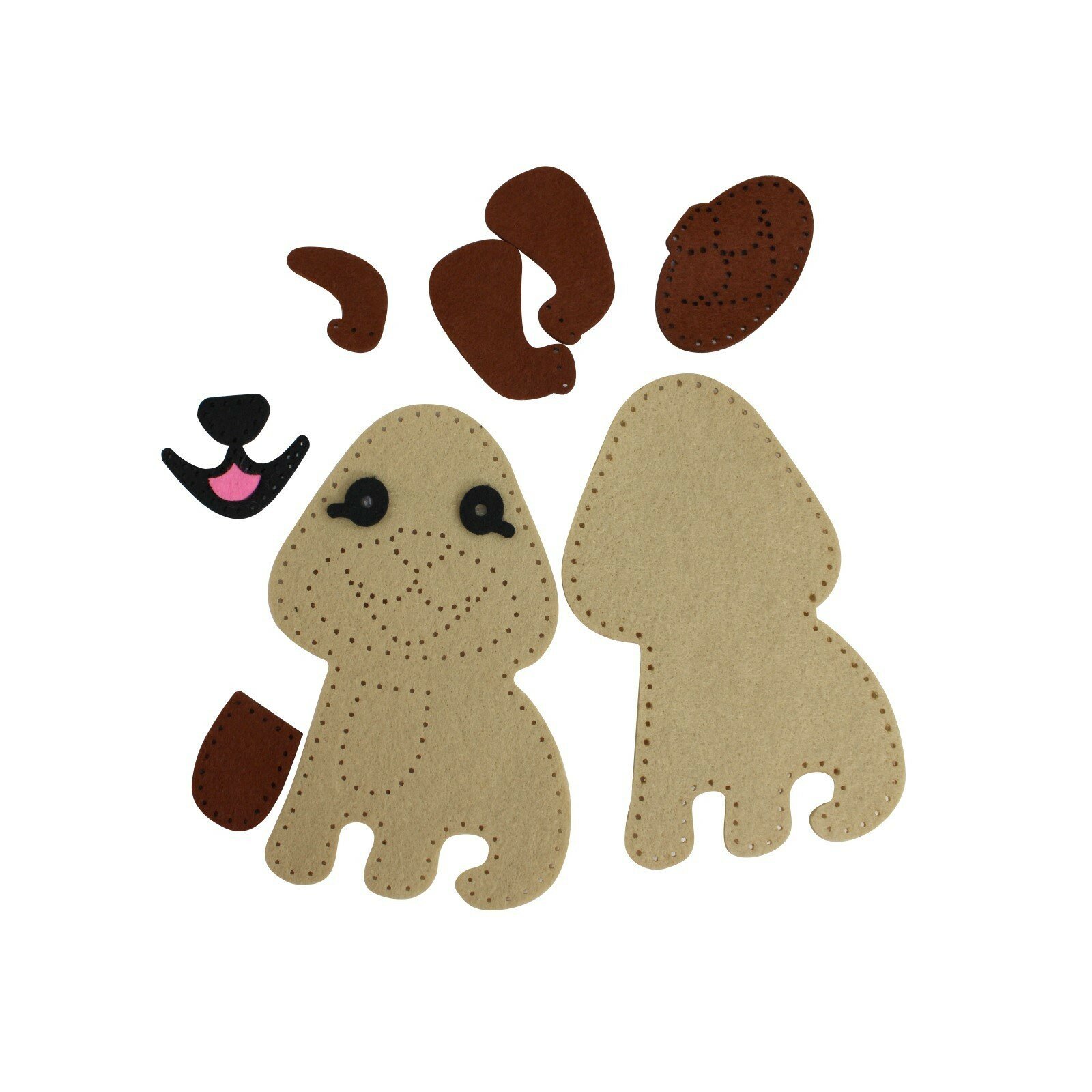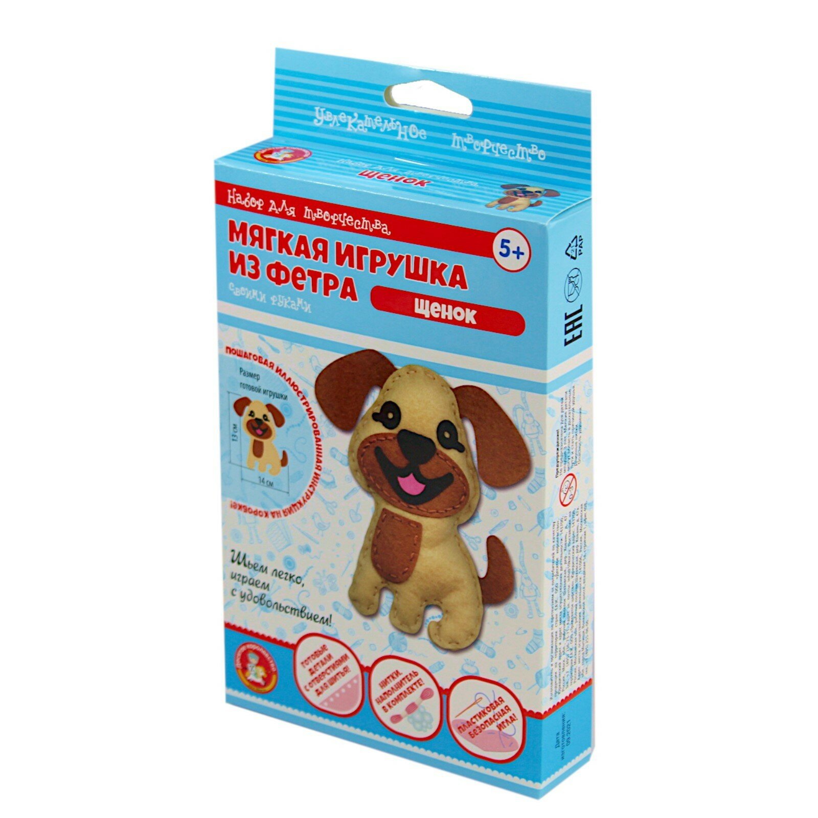 | Состав набора | фигурка щенка из фетра – 1 шт. (13 х 14 см), заготовки из фетра с перфорированными отверстиями, безопасная пластиковая иголка – 1 шт. (5 см), наполнитель, нитки черного, коричневого, бежевого цветов |