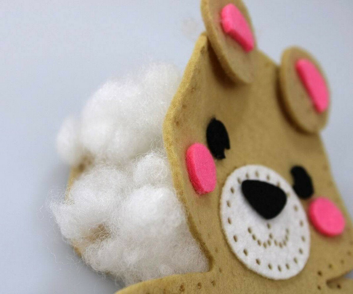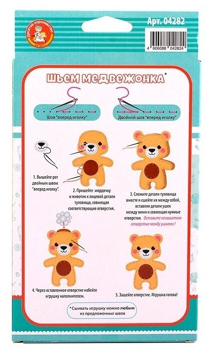 Мягкая игрушка из цветного фетра – это отличная идея для подарка! С данным набором вы легко создадите игрушку самостоятельно, дополнительно вам больше ничего не потребуется. Вышейте ротик двойным швом «вперёд иголку» и пришейте нос. Пришейте мордочку к лицевой детали туловища, совмещая соответствующие отверстия. Сложите детали туловища вместе и сшейте их между собой, вставляя детали хвоста и ушек между ними и совмещая нужные отверстия. Отверстие между ушками оставьте не зашитым. Через оставленное отверстие набейте игрушку наполнителем. Зашейте отверстие. Игрушка готова! Шить можно техникой «шов вперёд иголку» или двойным швом «вперёд иголку». Инструкция изображена на обратной стороне упаковки.Набор для создания игрушки из цветного фетра отлично подходит для поделки в детский сад и в школу. Очаровательная мягкая фетровая игрушка станет приятным подарком для ваших близких. Создание игрушки своими руками способствует воспитанию усидчивости, развитию фантазии, творческого мышления, мелкой моторики и навыков шитья.Состав набора: фигурка медвежонок из фетра – 1 шт. (15 х 14,5 см) заготовки из фетра с перфорированными отверстиями безопасная пластиковая иголка – 1 шт. (5 см) наполнитель нитки розового, фиолетового и белого цветаХарактеристики: Возраст: от 5 лет. Состав: текстильный материал, полимерный материал.