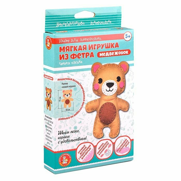 | Состав набора | фигурка медвежонка из фетра - 1 шт. (10 х 15 см), заготовки из фетра с перфорированными отверстиями, безопасная пластиковая иголка - 1 шт. (5 см), наполнитель, нитки черного, белого, бежевого, коричневого цветов |