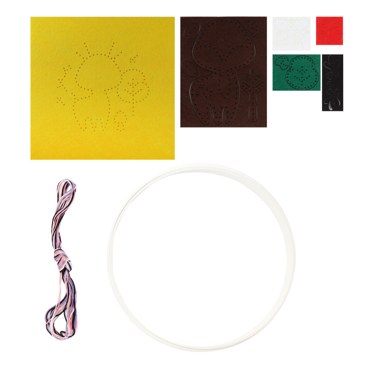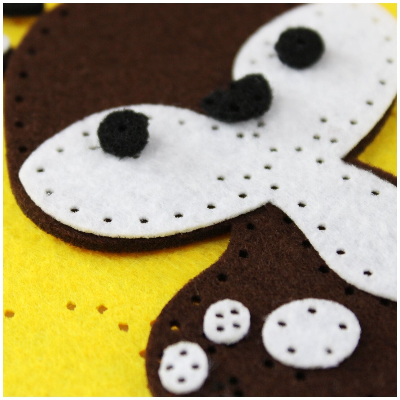 | Состав набора | детали из текстильного материала с готовыми отверстиями для шитья, нитки (чёрный, белый, коричневый), безопасная пластиковая игла – 1 штука, пяльцы – 1 штука (диаметр 15 см), наполнитель в пакете |