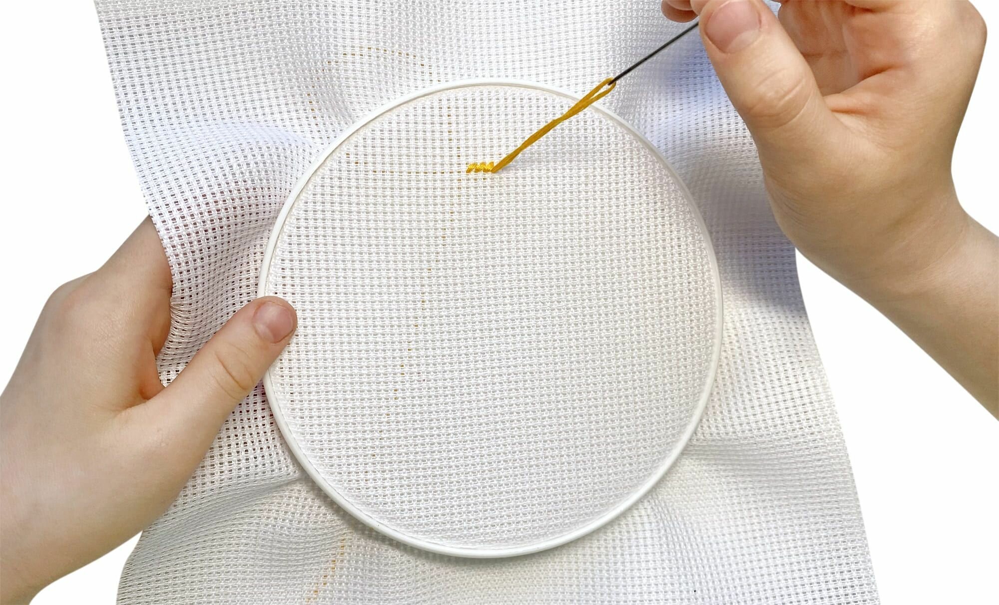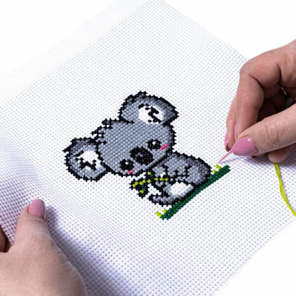 Набор для вышивания "Коала" (в конверте). Вышивка для малышей. Набор для вышивания «Коала» станет хорошим подарком для любителей этого вида творчества. С его помощью можно вышить замечательную картинку, которая украсит любой интерьер. Вышивание развивает мелкую моторику, воображение, творческое и логическое мышление. Рекомендуемый возраст: старше 5 лет.Состав набора:• игла пластиковая – 1 шт. (4,8 см)• белая канва – 1 шт. (26 х 26 см)• нитки мулине 7 цветов (розовый, зелëный, светло-зеленый, серый, белый, темно-серый, черный)• цветная схема вышивки – 1 шт.Пяльца в комплект не входят!Как вышивать?Прежде чем приступить к вышивке, края канвы следует обработать, обметав на машинке или вручную. Найдите центр. Определите его на глаз или сложите 2 раза ткань пополам и аккуратно отметьте середину карандашом. Вставьте канву в пяльцы. Совместите центр канвы с центром на схеме, обозначенным квадратиками, с контрастным контуром и стрелками. Выполняйте вышивку крестиками в 4 нитки. Возьмите нить нужного цвета, отделите от неё 2 нитки и проденьте в иголку. Закрепите нить с изнанки. Избегайте в работе узелков. На коробке изделия нарисованы схемы, на которой показано, как правильно вышивать крестиком.