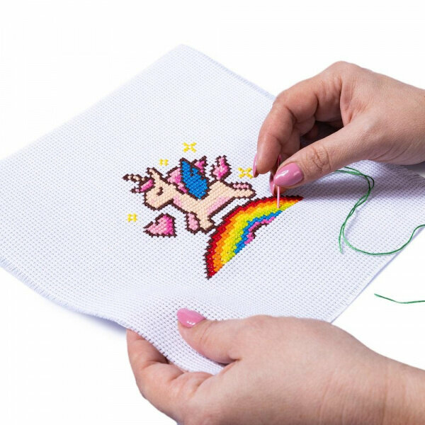 Набор для вышивания «Единорог» создан специально для любителей мифических животных и рукоделия. С его помощью можно вышить необычного персонажа. Процесс вышивания развивает мелкую моторику, воображение, творческое и логическое мышление. А готовая вышивка станет памятным подарком для друзей и родных.Состав набора:• игла пластиковая – 1 шт. (4,8 см)• белая канва – 1 шт. (26 х 26 см)• нитки мулине 7 цветов (красный, оранжевый, желтый, зелëный, голубой, розовый, коричневый)• цветная схема вышивки – 1 шт.Размер готовой вышивки 10х10 смПяльца в комплект не входят!Рекомендуемый возраст: старше 5 лет.Как вышивать?Прежде чем приступить к вышивке, края канвы следует обработать, обметав на машинке или вручную.Найдите центр. Определите его на глаз или сложите 2 раза ткань пополам и аккуратно отметьте середину карандашом. Вставьте канву в пяльцы. Совместите центр канвы с центром на схеме, обозначенным квадратиками, с контрастным контуром и стрелками.Выполняйте вышивку крестиками в 4 нитки. Возьмите нить нужного цвета, отделите от неё 2 нитки и проденьте в иголку. Закрепите нить с изнанки. Избегайте в работе узелков.На коробке изделия нарисованы схемы, на которой показано, как правильно вышивать крестиком.