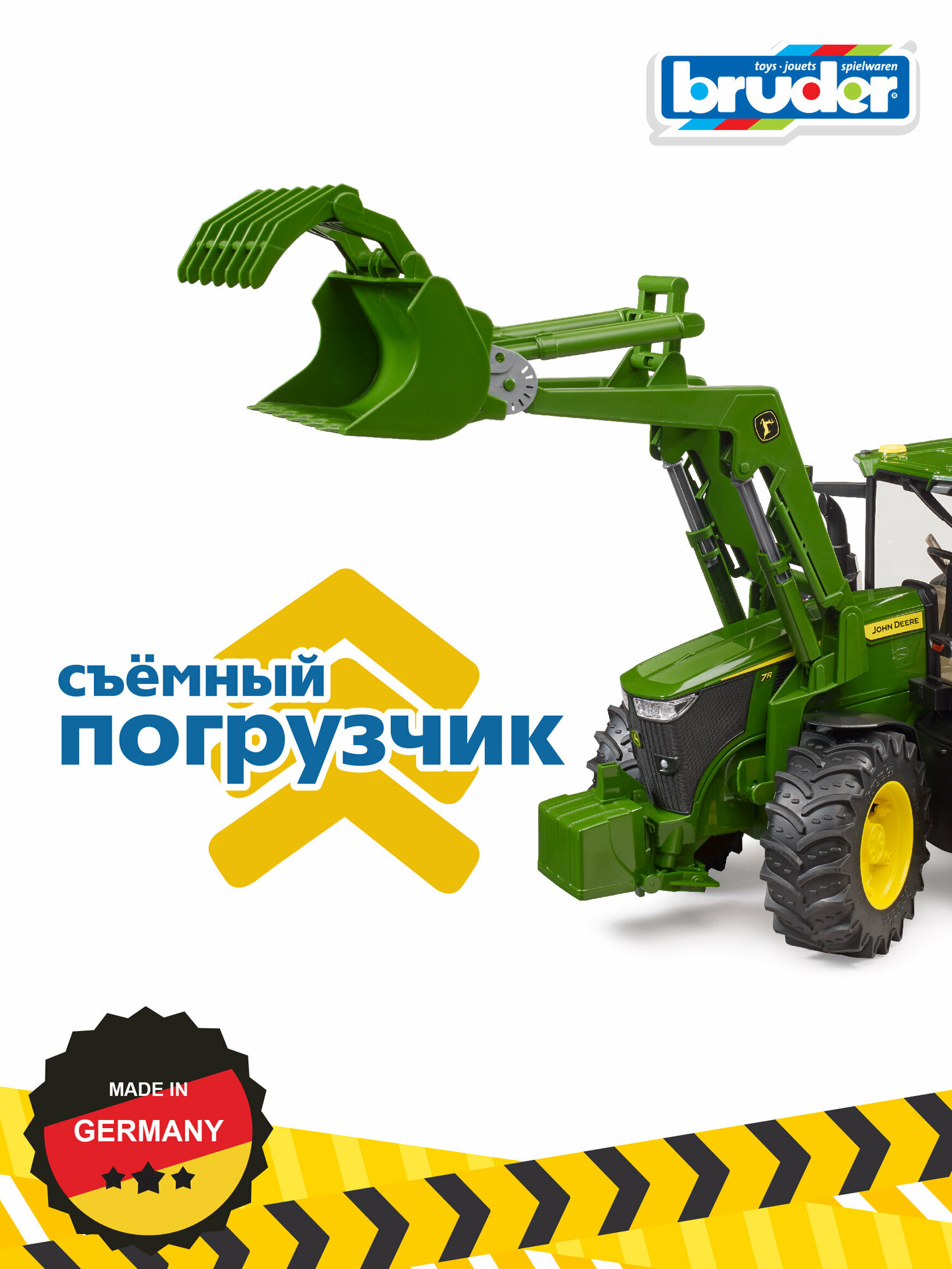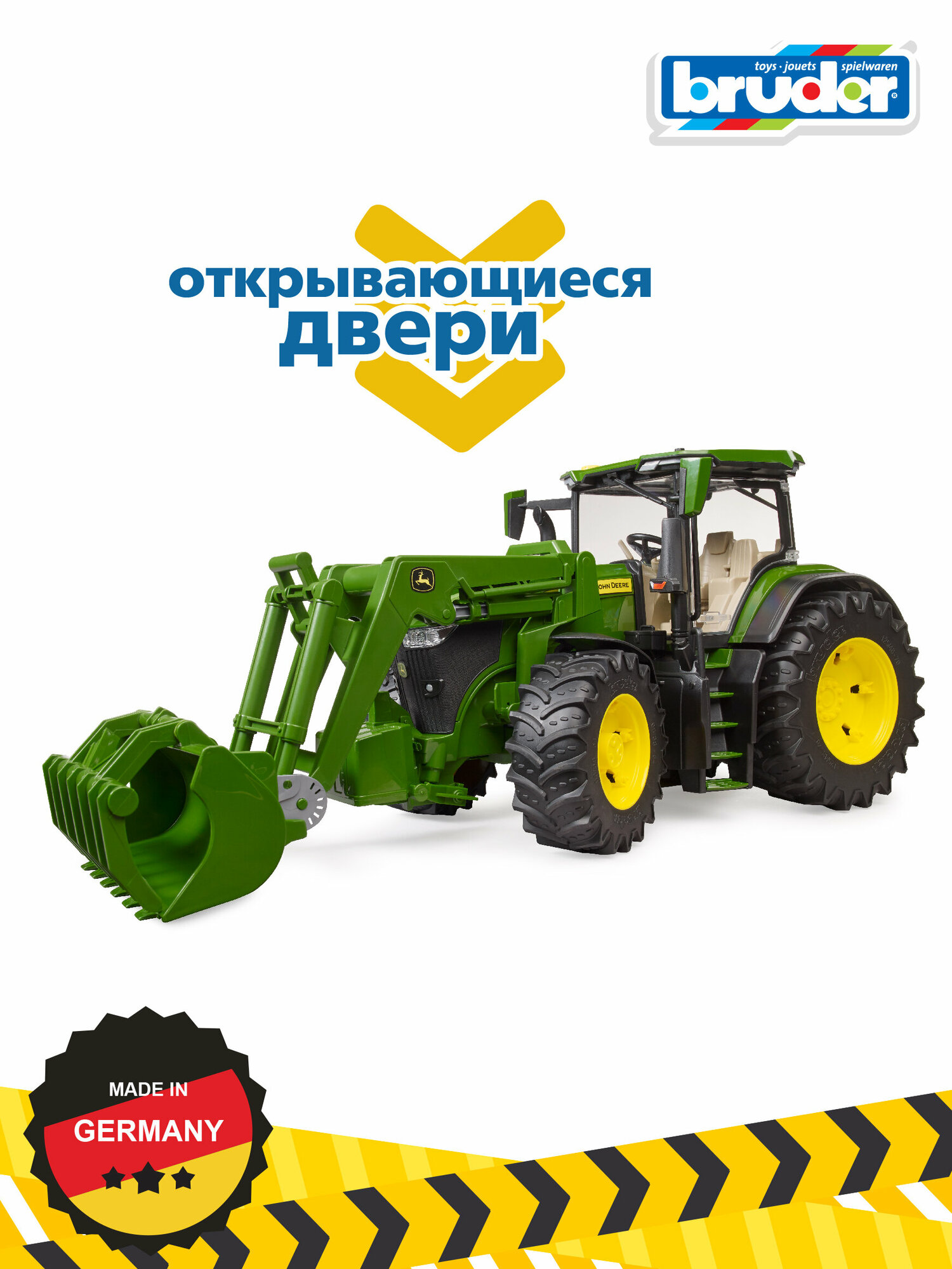 Игрушка от бренда Bruder 03-151 Трактор John Deere несомненно понравится вашему ребенку. Тракторы John Deere серии 7R: малый общий вес сочетается с высокой производительностью. Этот маневренный трактор не только ускоряет транспортировку, но и двигает вперед любую ферму. Трактор оснащен множеством реалистичных деталей. Капот открывается, открывая впечатляющий двигатель. Игрушка имеет открывающуюся дверцу, через которую в кабину можно поместить любую фигурку Bruder. Типичными для BRUDER также являются превосходная управляемость и комфорт при вождении благодаря встроенной маятниковой оси и удлинителю рулевого управления, которым можно управлять с помощью рулевого колеса, вставленного в крышу. оригинальный фронтальный погрузчик был прикреплен к трактору для увеличения функциональности игрушки. Благодаря этому машина может легко загружать тюки, древесину или другой материал на сельскохозяйственный прицеп. На этот трактор можно установить все прицепы из сельскохозяйственной линейки BRUDER.