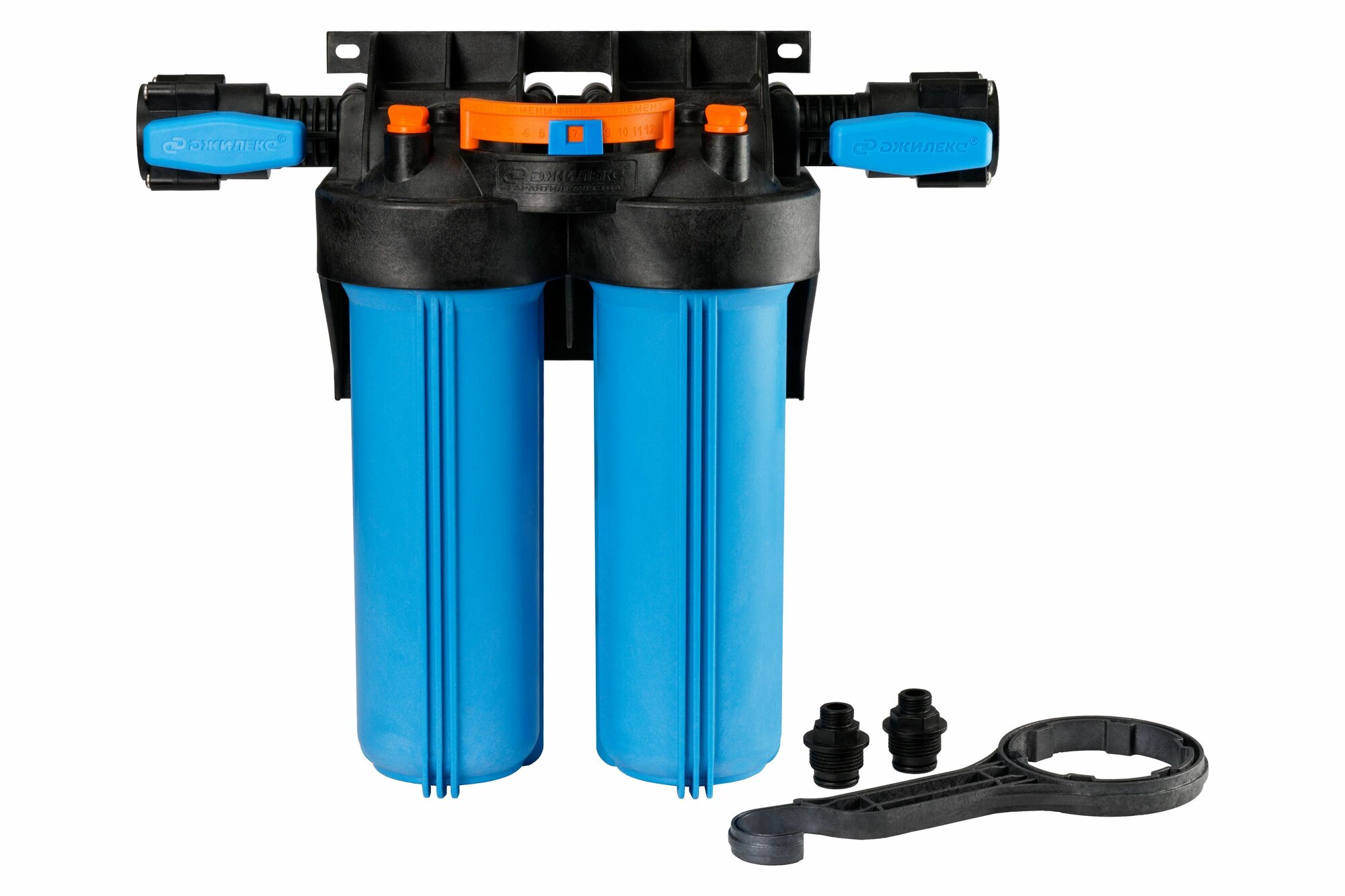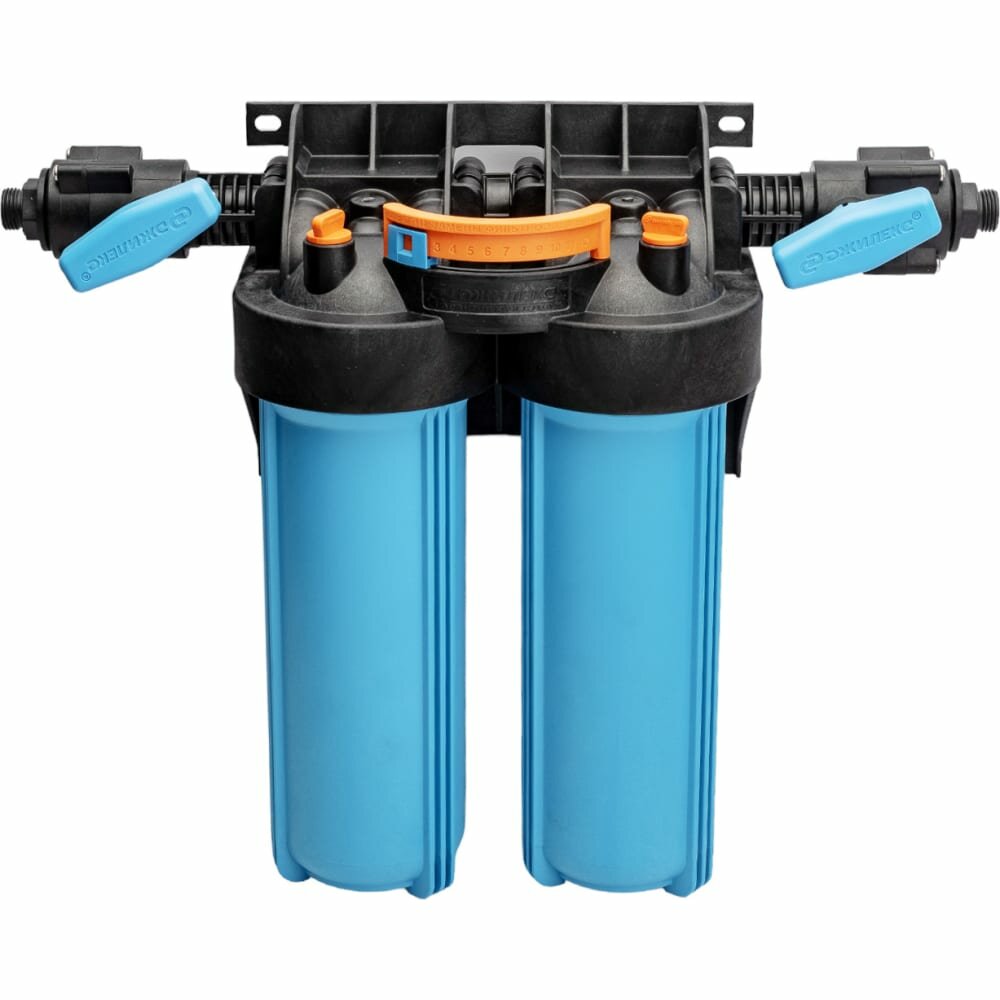 Корпус для картриджного фильтра Джилекс 1 М Т2 предназначен для размещения в нём картриджей или фильтрующей засыпки для дальнейшей очистки холодной воды в бытовых условиях. Изготавливается из армлена, прочного материала устойчивого к циклическим нагрузкам и не пропускающего ультрафиолетовые лучи сквозь корпус. Типоразмер колб - Slim Line 10”. Использование двухступенчатых корпусов фильтра рекомендуется в случаях, где необходимы картриджи разных фильтрующих свойств. Это существенно облегчит монтаж и последующее обслуживание системы по сравнению с одинарными корпусами. Поворот коллектора на 180° позволяет установить корпус фильтра в магистраль, с направлением движения воды, как слева направо, так и справа налево. Компактное расположение парных корпусов. Магистральную трубу можно разместить вплотную к стене. Кронштейн является одним целым с крышкой корпуса фильтра. В корпусе предусмотрены специальные технологические отверстия (пробки) для сброса избыточного давления и слива остаточной воды. В комплект поставки входит ключ, с помощью которого можно отвернуть колбу от крышки, а также уплотнительная вставка белого цвета для картриджных элементов без сердечника. На концах коллектора встроены шаровые краны.