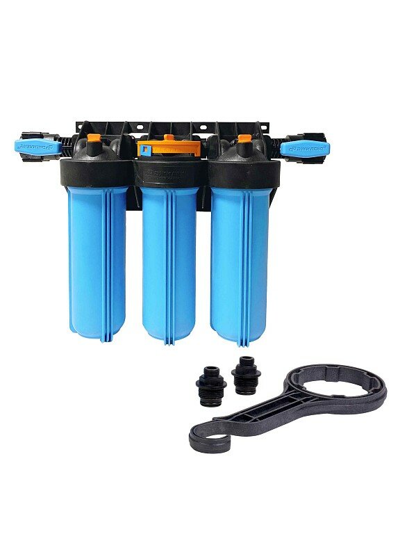 Корпус для картриджного фильтра Джилекс 1 М Т3 предназначен для размещения в нём картриджей или фильтрующей засыпки для дальнейшей очистки холодной воды в бытовых условиях. Изготавливается из армлена, прочного материала устойчивого к циклическим нагрузкам и не пропускающего ультрафиолетовые лучи сквозь корпус. Типоразмер колб - Slim Line 10”. Использование трехступенчатых корпусов фильтра рекомендуется в случаях, где необходимы картриджи разных фильтрующих свойств. Это существенно облегчит монтаж и последующее обслуживание системы по сравнению с одинарными корпусами. Поворот коллектора на 180° позволяет установить корпус фильтра в магистраль, с направлением движения воды, как слева направо, так и справа налево. Компактное расположение парных корпусов. Магистральную трубу можно разместить вплотную к стене. Кронштейн является одним целым с крышкой корпуса фильтра. В корпусе предусмотрены специальные технологические отверстия (пробки) для сброса избыточного давления и слива остаточной воды. В комплект поставки входит ключ, с помощью которого можно отвернуть колбу от крышки, а также уплотнительная вставка белого цвета для картриджных элементов без сердечника. На концах коллектора встроены шаровые краны.