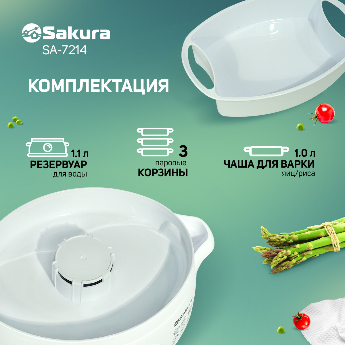 Пароварка SAKURA SA-7214 3ч (90л) 800Вт белый
