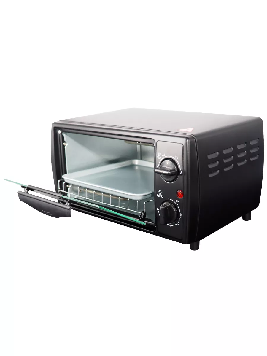 Мини-печь (духовка), 10 л, 1000 Вт, 2 нагреват.элемента из нерж.стали, регулировка температуры 100-250С, 30-минутный таймер со звонком, световой индикатор работы, решетка с противнем выдвигаются при открытии дверцы