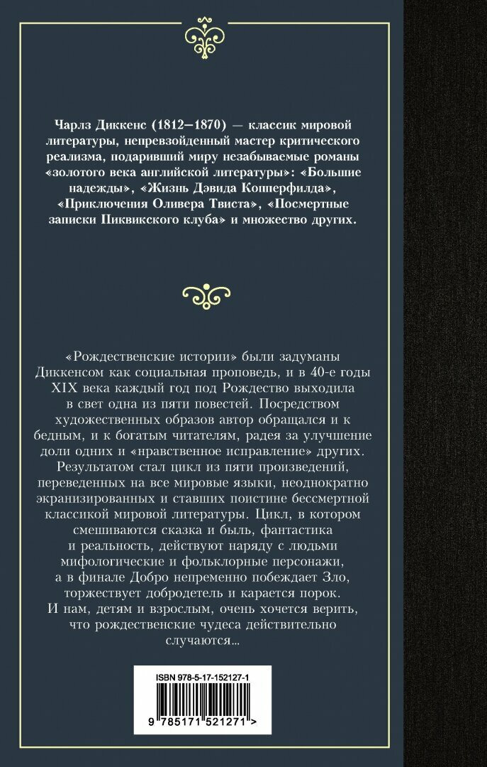 "Рождественские истории" были задуманы Диккенсом как социальная проповедь, и в 40-е годы XIX века каждый год под Рождество выходила в свет одна из пяти повестей. Посредством художественных образов автор обращался и к бедным, и к богатым читателям, радея за улучшение доли одних и "нравственное исправление" других.Результатом стал цикл из пяти произведений, переведенных на все мировые языки, неоднократно экранизированных и ставших поистине бессмертной классикой мировой литературы. Цикл, в котором смешиваются сказка и быль, фантастика и реальность, действуют, наряду с людьми, мифологические и фольклорные персонажи, а в финале Добро непременно побеждает Зло, торжествует добродетель и карается порок. И нам, детям и взрослым, очень хочется верить, что рождественские чудеса действительно случаются…