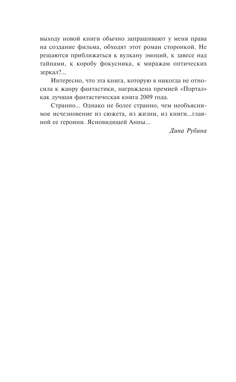 У Дины Рубиной очень своеобразные сюжеты и особый стиль. Порой продираешься сквозь строчки, читая между... Эта история вызывает ассоциации с Каем, котрый из льдинок складывает "Вечность". Так и читатель из фраз, писем, обрывков пытается выстроить картину жизни необыкновенной девушки Анны. Талант на грани безумия. Гениальность как проклятие. И зеркала, которые становятся важными действующими лицами, а порой и инициаторами многих событий. В финале остаётся тягостно-гнетущее после...