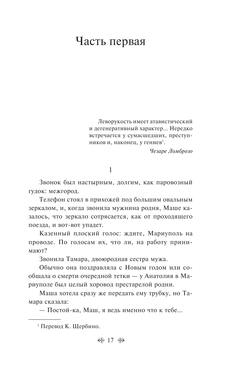 Она пишет зеркальным почерком, от которого у непосвященных кружится голова. У нее блестящие способности к математике и физике, она гениальная циркачка, невероятный каскадер, она знает о зеркалах все, что можно о них знать. Она умеет видеть прошлое и прозревать будущее. Киев, Москва, Франкфурт, Индианаполис, Монреаль — она летит по жизни, неприкаянная и несвободная, видит больше, чем обычный человек способен вообразить, — и ненавидит за это себя и того, кто наделил ее такой способностью.
