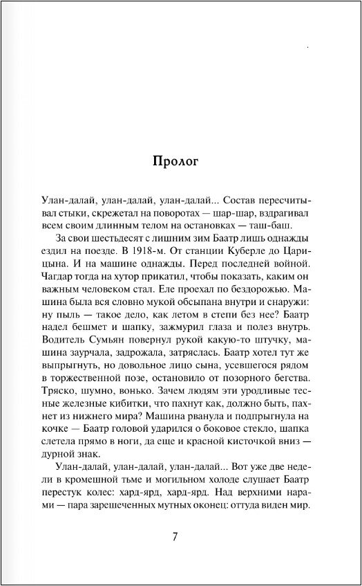 "Перед нами история калмыков, долгих четыре века верой и правдой служивших “Белому царю”, — история сбывшихся и не сбывшихся надежд, военных подвигов и тяжких мытарств в годы депортации. Глазами трех поколений одной семьи — деда, сына и внука — автор видит советское прошлое. Но лишь один из них, прозрев к концу жизни, приходит к исчерпывающему осознанию его сути".