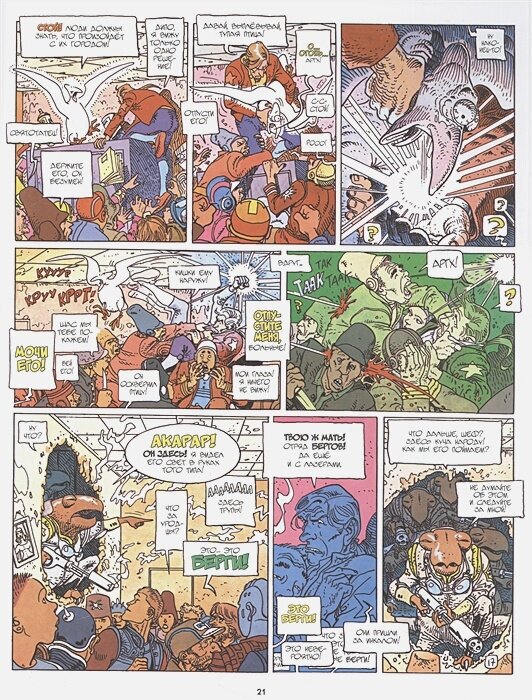 Фантастика на грани безумия. Даже сейчас похождения Джона Дифула в подземных, межзвездных и инопланетных мирах кажутся головокружительным аттракционом, представляю, какое впечатление производил комикс на первых читателей в восьмидесятых годах прошлого века. И это только первый, самый верхний слой восприятия. Если углубиться, можно увидеть здесь и символику Таро, и психоаналитические идеи Юнга (одну из героинь зовут Анима), и даже социальную сатиру на общество потребления. Словом, комикс заслуженно считается классическим.