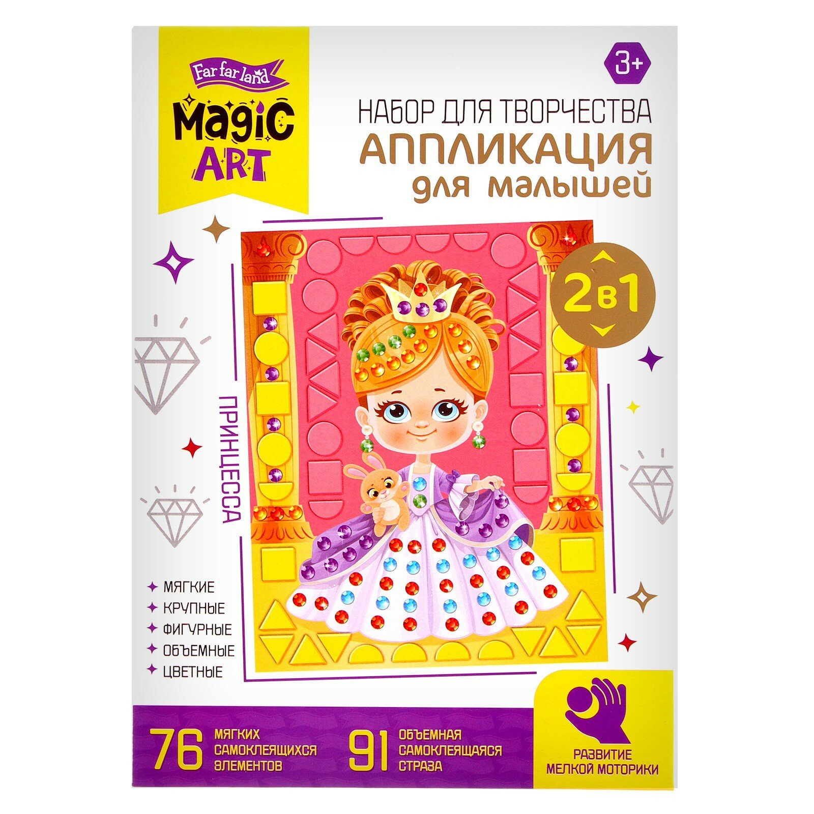 Набор для творчества серии Magic Art «Принцесса» создан специально для девочек. Приобщите ребенка к творчеству! С набором можно создать красивую картинку, которая станет хорошим подарком для друзей и близких. Создание аппликации способствует развитию мелкой моторики, усидчивости, внимательности и эстетического вкуса. Готовую картину можно оформить в рамку (в комплект не входит) и украсить ею комнату. Набор отлично подходит как для домашнего творчества, так и для творческих занятий в детских учреждениях. Состав: — картонная основа с напечатанным цветным рисунком – 1 шт. (20х16 см) — самоклеящиеся квадратики — 2 цвета (розовый и желтый) – 76 шт. (7х7х2 мм) — самоклеящиеся стразы — 5 цветов — 91 шт (диаметр 6 мм)Набор предназначен для детей от 3 лет.