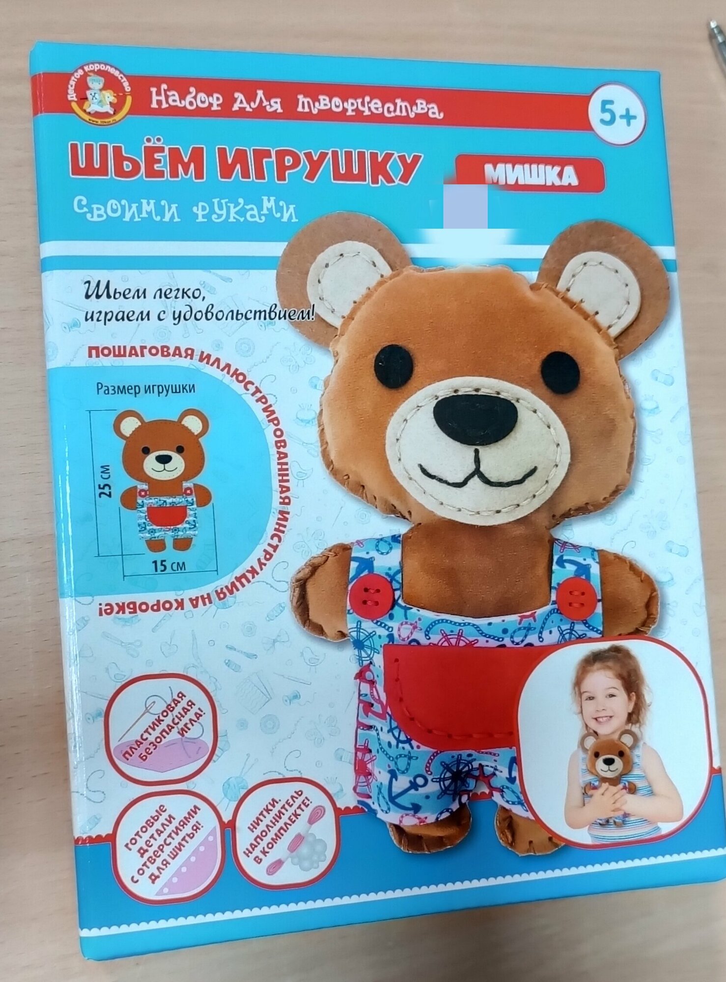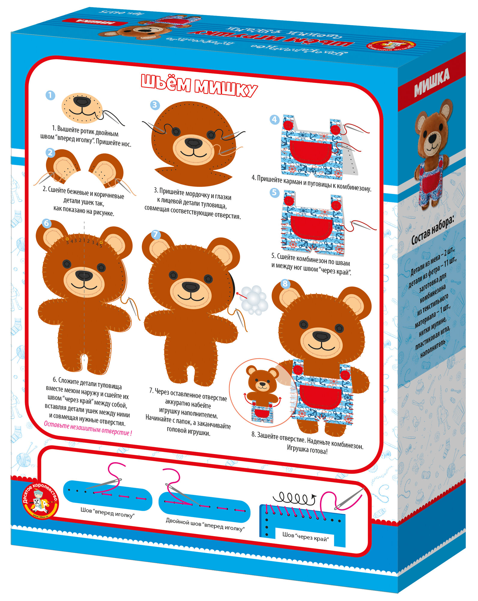Мягкая игрушка из цветного фетра и велюра – это отличная идея для подарка! С данным набором вы легко создадите игрушку Мишку самостоятельно, дополнительно вам больше ничего не потребуется. Размер готовой игрушки 25х15 см. Набор предназначен для детей от 5 лет. Как шить игрушку? 1. Вышейте ротик двойным швом «вперёд иголку». Пришейте нос. 2. Сшейте бежевые и коричневые детали ушек так, как показано на рисунке. 3. Пришейте мордочку и глазки к лицевой детали туловища, совмещая соответствующие отверстия. 4. Пришейте карман и пуговицы к комбинезону. 5. Сшейте комбинезон по швам и между ног «через край». 6. Сложите детали туловища вместе велюром наружу и сшейте их швом «через край» между собой, вставляя детали ушек между ними и совмещая нужные отверстия.Оставьте незашитым отверстие! 7. Через оставленное отверстие аккуратно набейте игрушку наполнителем. Начинайте с лапок, а заканчивайте головой игрушки. 8. Зашейте отверстие. Наденьте комбинезон. Игрушка готова! Шить можно техникой «шов вперёд иголку», двойным швом «вперёд иголку» и швом «через край». Инструкция изображена на обратной стороне упаковки. Набор Шьём игрушку своими руками «Мишка» отлично подходит для поделки в детский сад и в школу. Очаровательная мягкая игрушка из велюра и фетра станет приятным подарком для Ваших близких. Создание игрушки своими руками способствует воспитанию усидчивости, развитию фантазии, творческого мышления, мелкой моторики и навыков шитья.