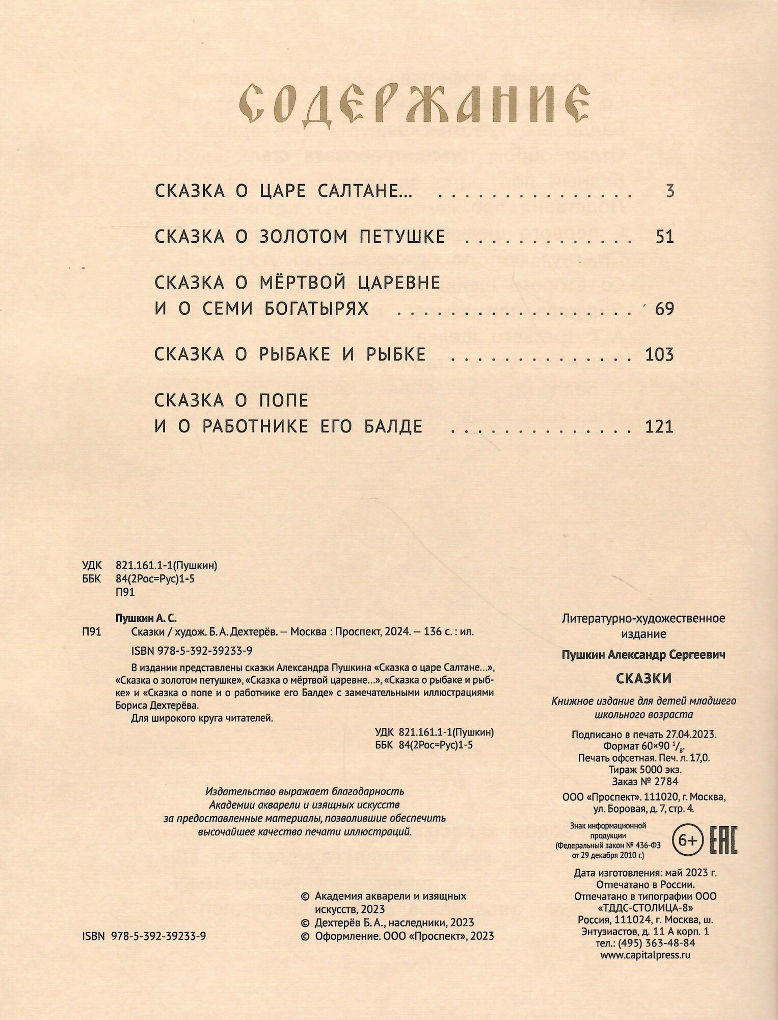 В издании представлены сказки Александра Пушкина «Сказка о царе Салтане », «Сказка о золотом петушке», «Сказка о мёртвой царевне » «Сказка о рыбаке и рыбке» и «Сказка о попе и о работнике его Балде» с замечательными иллюстрациями Бориса Дехтерёва.