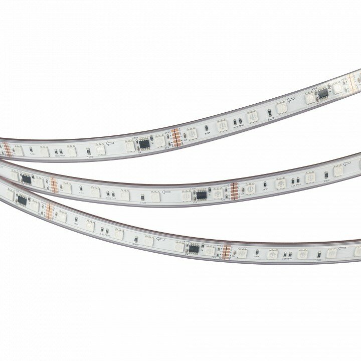Светодиодная лента DMX-PFS-B60, герметичная IP68 (PFS - полная силиконовая экструзия), с микросхемой GS8516. Светодиоды 5060, 60 шт/м (1 pixel = 6 LED), белая плата, скотч 3М. Цвет RGB, угол 120°. Питание 24 В, мощность 14 Вт/м (70 Вт на 5 м). Размеры 5000x12x5 мм. Мин. отрезок 100 мм, 6 светодиода. Цена за 1 м.