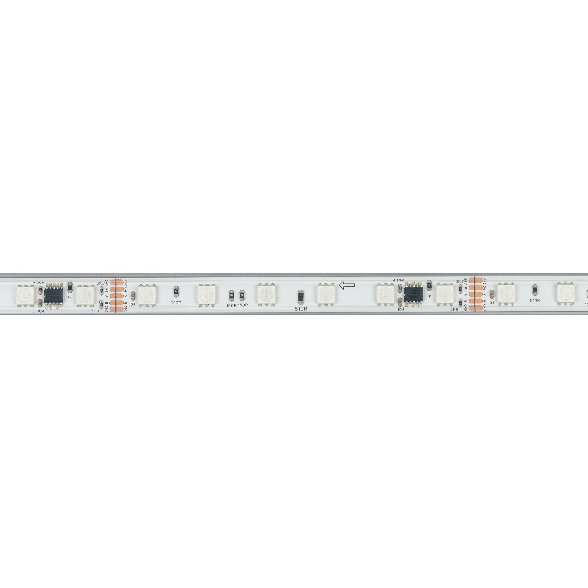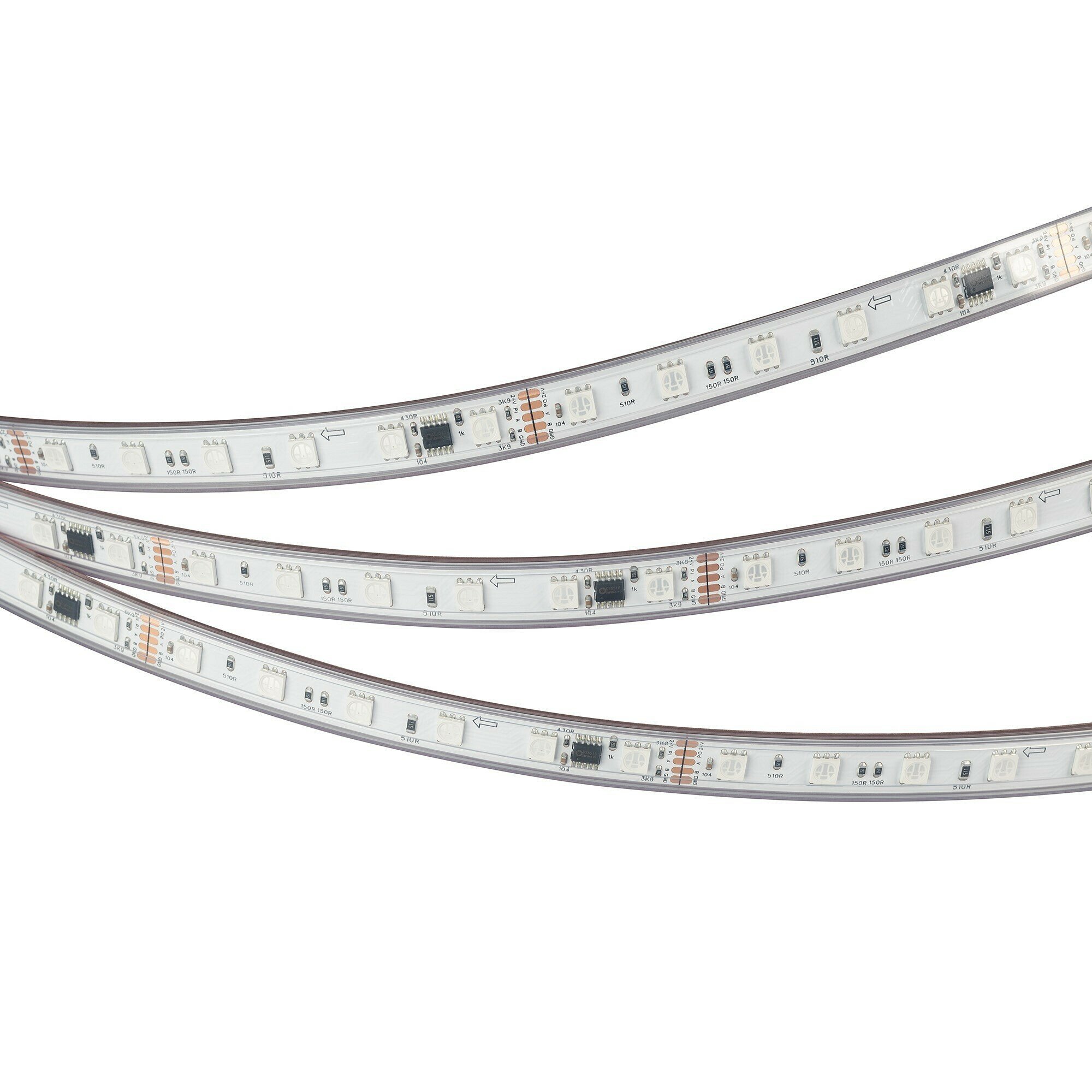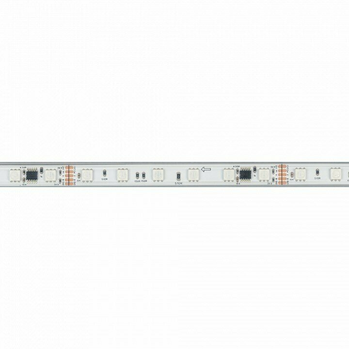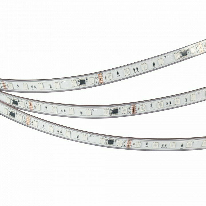 Светодиодная лента DMX-B60, герметичная IP67 (PS - силиконовая экструзия), с микросхемой GS8516. Светодиоды 5060, 60 шт/м (1 pixel = 6 LED), белая плата, скотч 3М. Цвет RGB, угол 120°. Питание 24 В, мощность 14 Вт/м (70 Вт на 5 м). Размеры 5000x12x5 мм. Мин. отрезок 50 мм, 6 светодиода. Цена за 1 м.