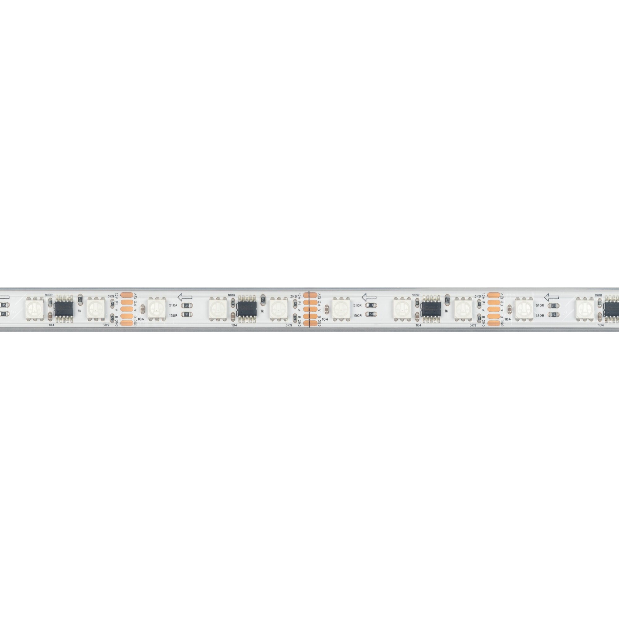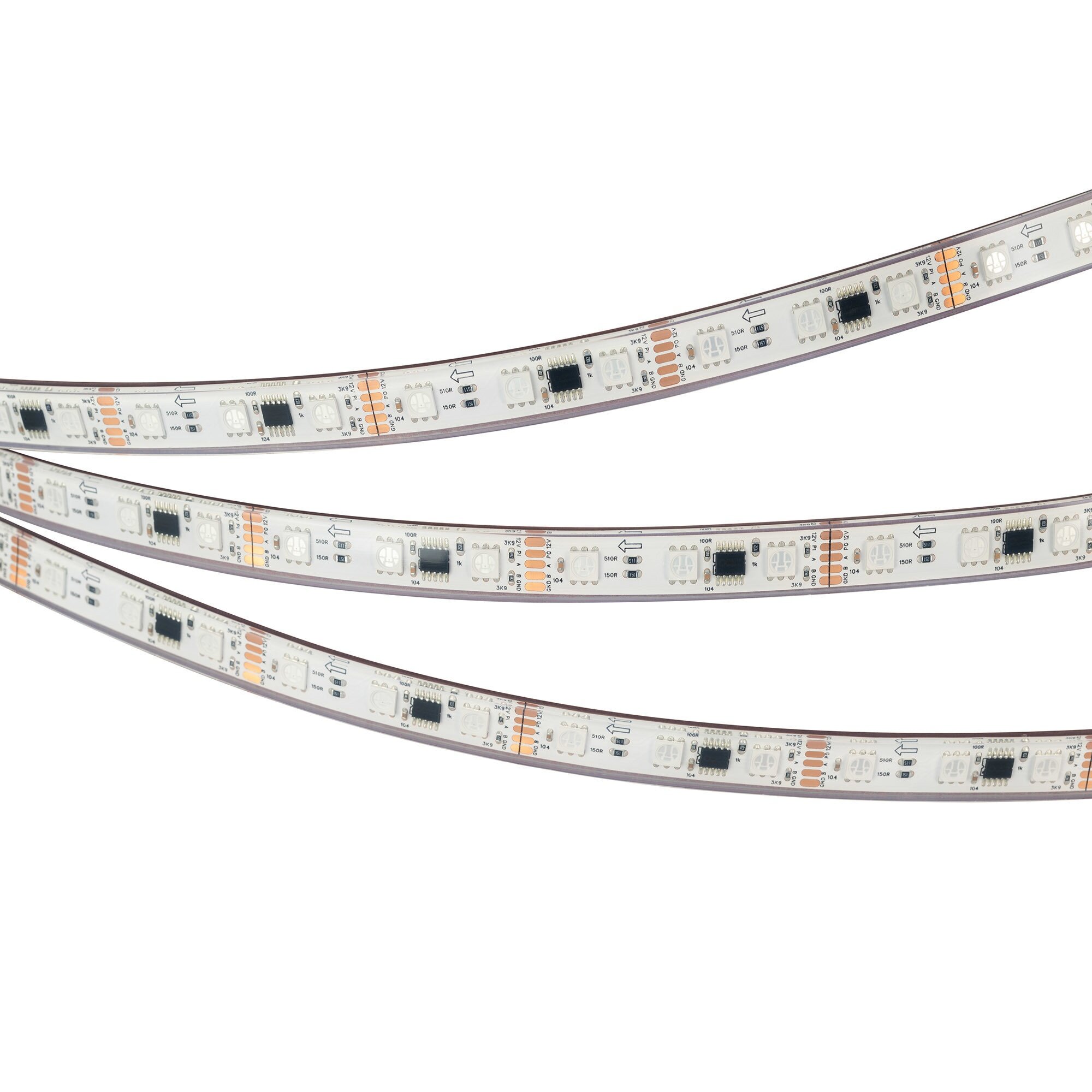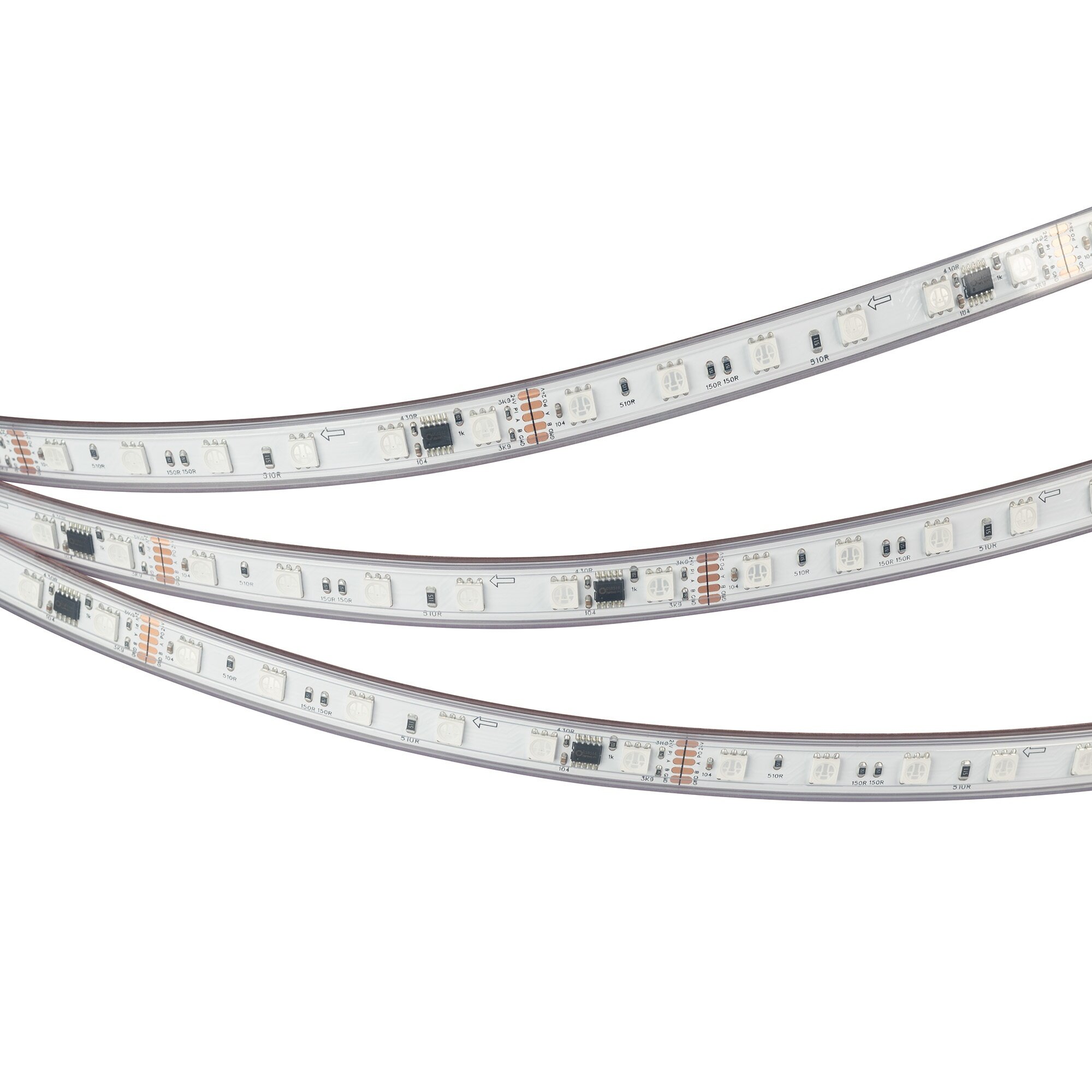 Светодиодная лента DMX-PS-B60, герметичная IP67 (PS - силиконовая экструзия), с микросхемой GS8516. Светодиоды 5060, 60 шт/м (1 pixel = 3 LED), белая плата, скотч 3М. Цвет RGB, угол 120°. Питание 12 В, мощность 14 Вт/м (70 Вт на 5 м). Размеры 5000x12x5 мм. Мин. отрезок 50 мм, 3 светодиода. Цена за 1 м.
