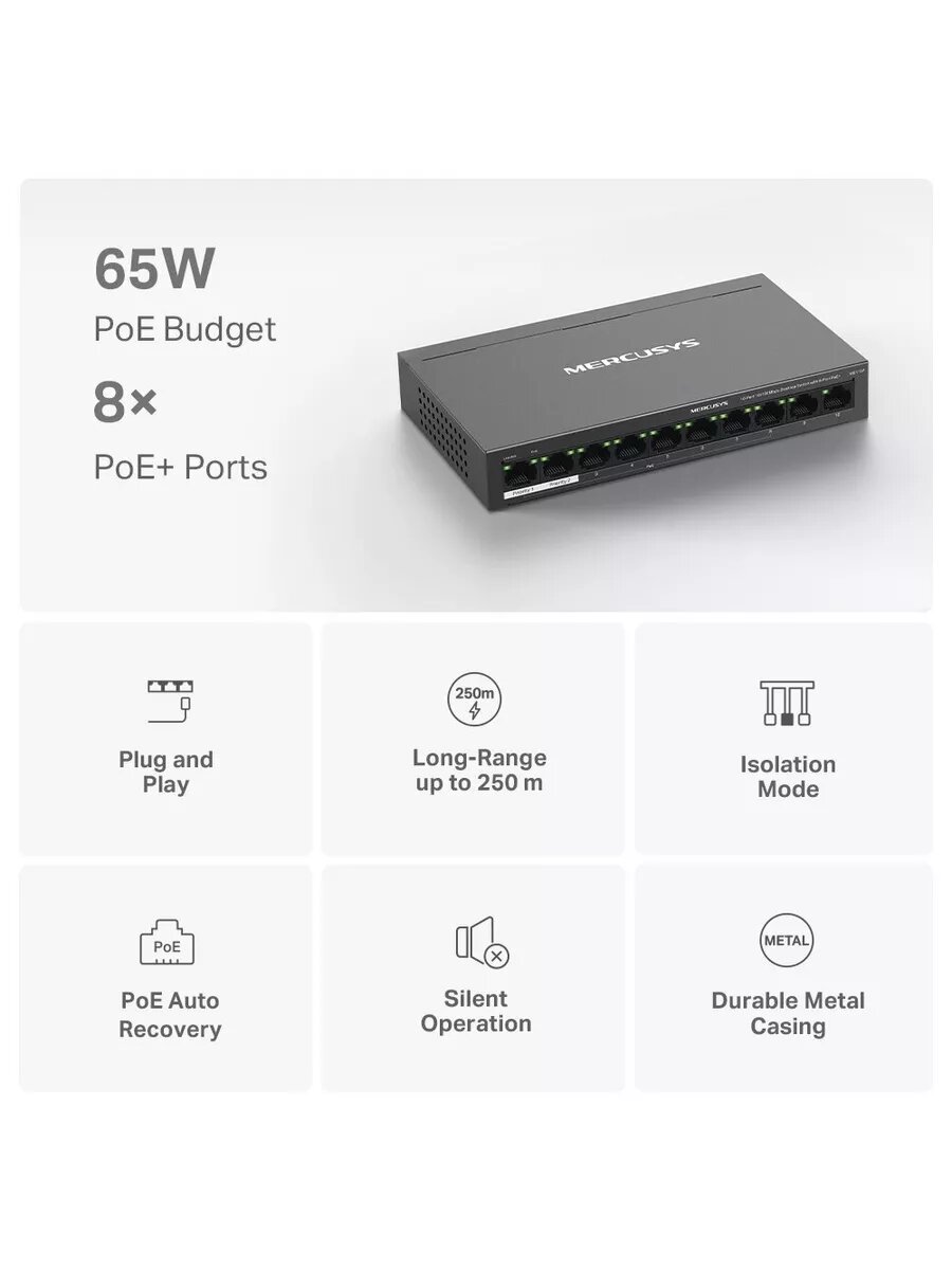 Всего коммутатора MS110P десять портов, восемь из которых поддерживают технологию PoE. Бюджет каждого порта PoE+ составляет 30 Вт. Такие порты позволяют подавать питание на устройства стандартов 802.3af/at. Общий бюджет PoE составляет 65 Вт. Этого хватит для развертывания системы видеонаблюдения офисах общежитиях. Технология PoE позволяет подавать питание на точки доступа, IP-телефоны, компьютеры, видеорегистраторы ряд других устройств. Режим изоляции позволяет одним нажатием разделить трафик портов 1–8 для защиты от прослушки вмешательств, также для изолирования широковещательных штормов. Также MS110P есть два порта Uplink, необходимых при включении режима изоляции. Коммутатор постоянно отслеживает процесс обмена данными питаемыми по PoE устройствами. Если питаемое устройство не будет отправлять пакеты данными на коммутатор течение продолжительного периода времени, коммутатор автоматически перезагрузит такое устройство. Долговечный металлический корпус MS110P обеспечивает эффективное рассеивание тепла, защиту от помех, стабильную работу долгий срок службы.