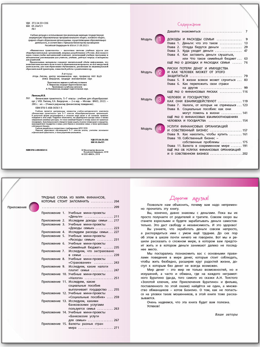 Учебник является центральным элементом учебно-методического комплекта «Финансовая грамотность» для 5–7 классов общеобразовательных организаций. В доступной форме рассказывается о сложном мире денег и об основных правилах поведения в этом мире. Подробно объясняется, как формируются доходы семьи и каковы направления семейных расходов, что такое семейный бюджет и почему важно его правильно планировать. Значительное место отводится темам защиты от риска потери денег и имущества, взаимодействия государства и семьи, роли банков в экономике семьи, а также организации собственного бизнеса.