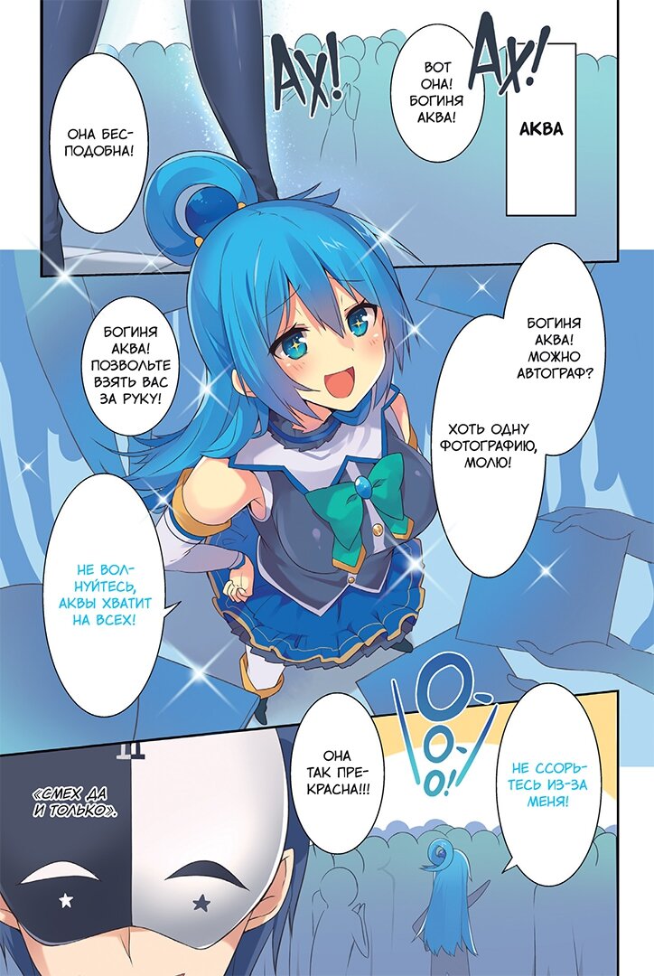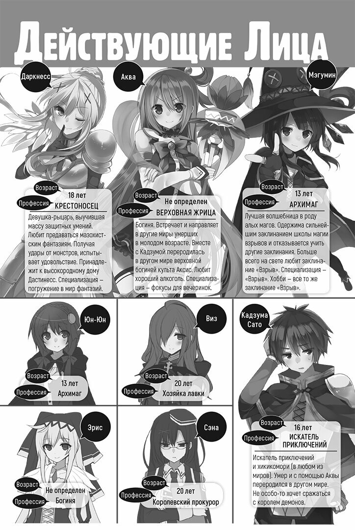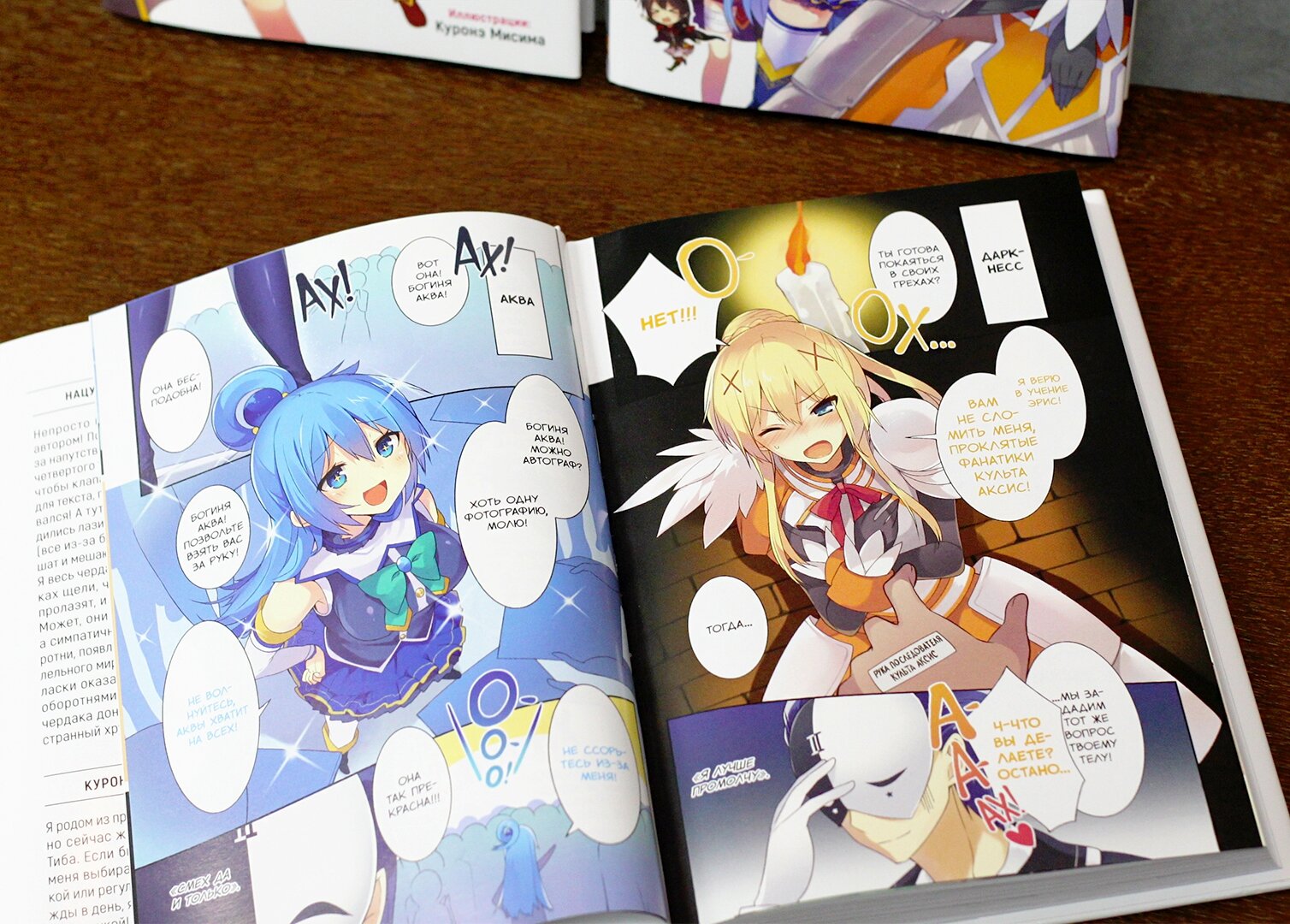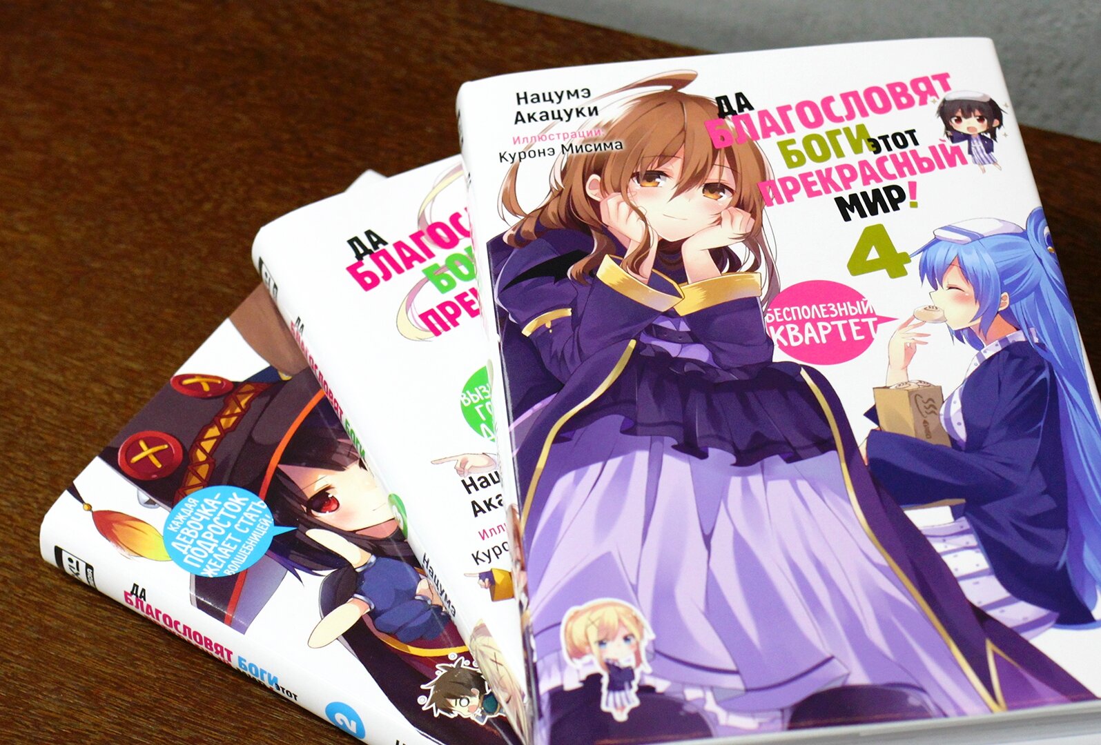 Редко встретишь сейчас годную комедию таково жанра ,но это не тот случай . Смешно,иронично местами доходит до абсурда , но за это мы и любим это произведение ,не так ли ? Изначально я посмотрела только аниме , но сейчас начала собирать данную серию и думаю ,что это книга станет следующей моей покупкой . Ведь как можно жить без Аквы,Мегуми,Кадзумы не говоря о Даркнес .Надеюсь дальше будет ещё больше самоиронии абсурда и комедии,