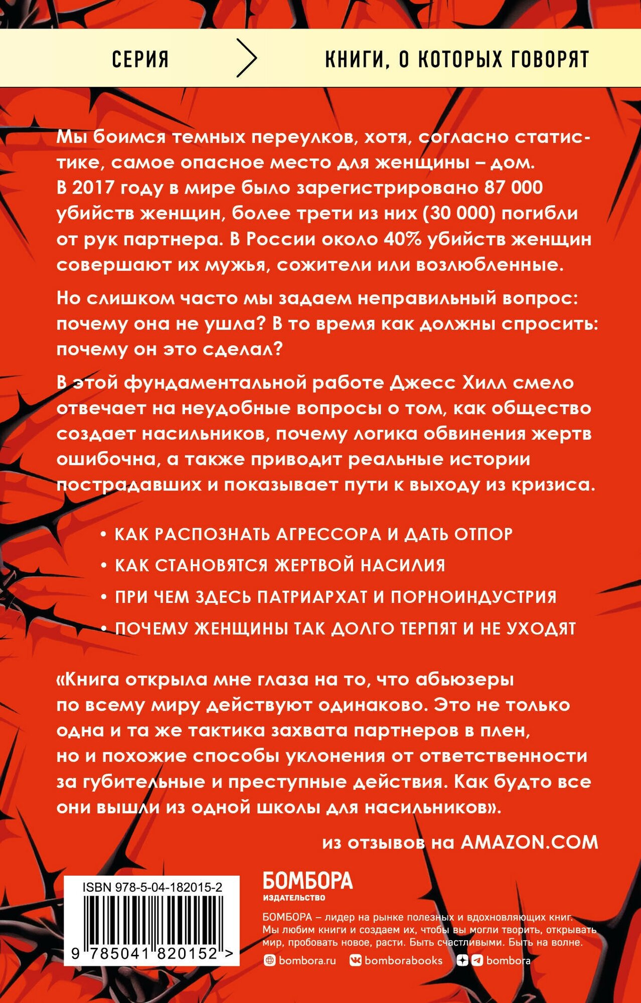 "Люди, которые не разбираются в проблеме домашнего насилия, часто спрашивают у меня: "Почему она не ушла, если муж ее бьет?" Но можно задать другой вопрос: "Почему ОН применяет насилие?" Книга Джесс Хилл очень развернуто и доступно отвечает на эти вопросы. Она говорит о насилии не просто как об ужасной и жестокой "традиции", а как о социальном и психологическом явлении. Я точно знаю, что насилие - это действительно сложный феномен, который требует комплексных мер и системной работы.