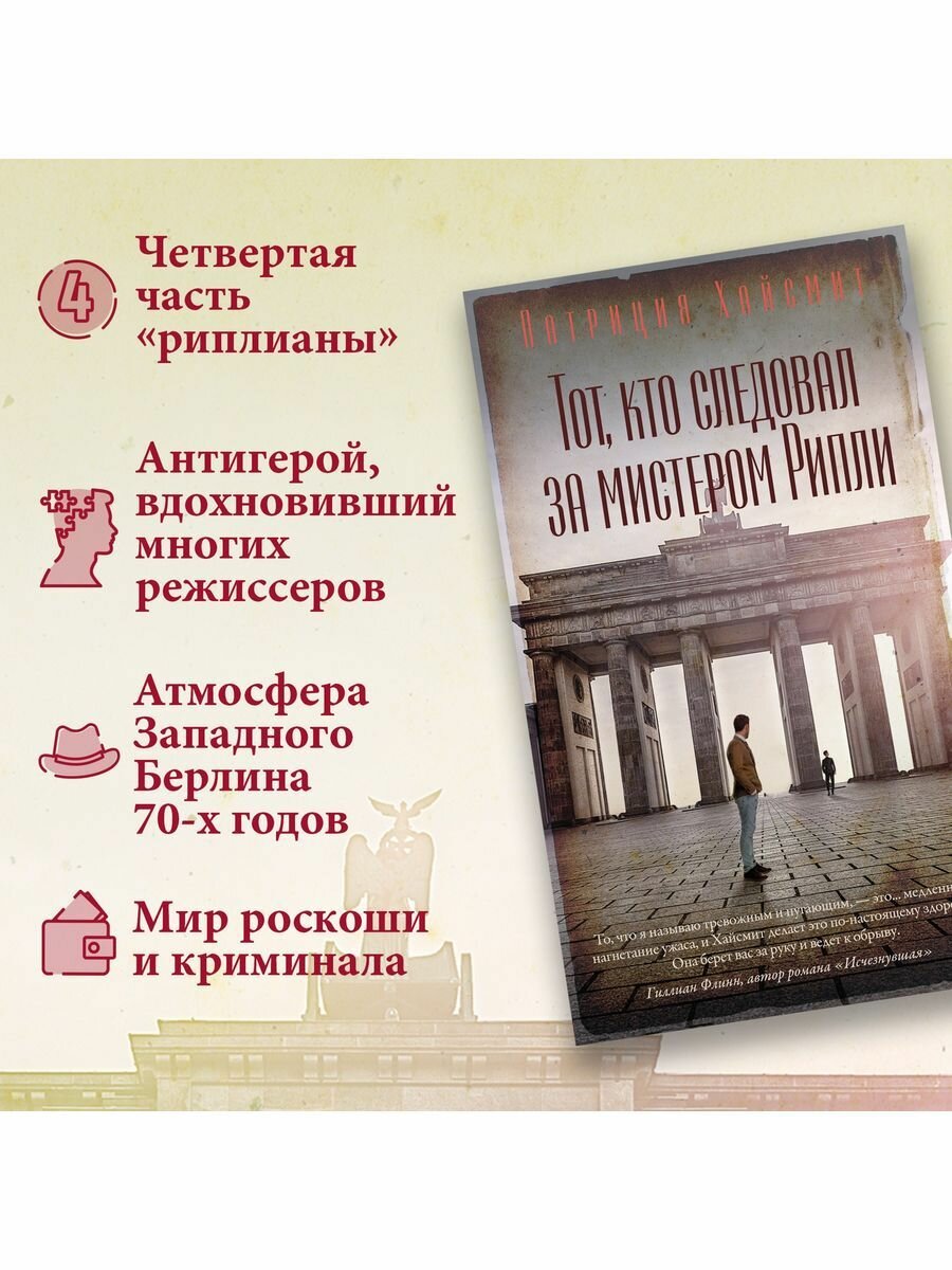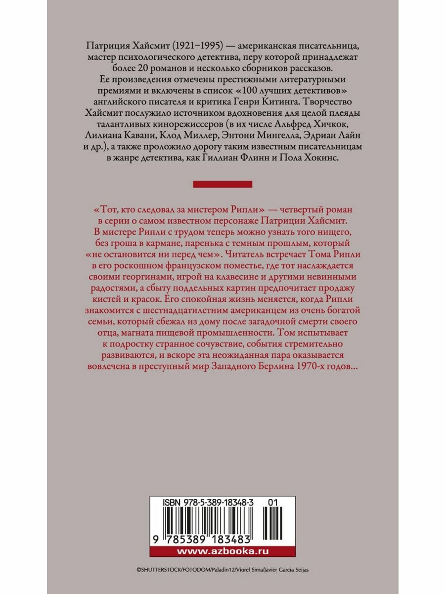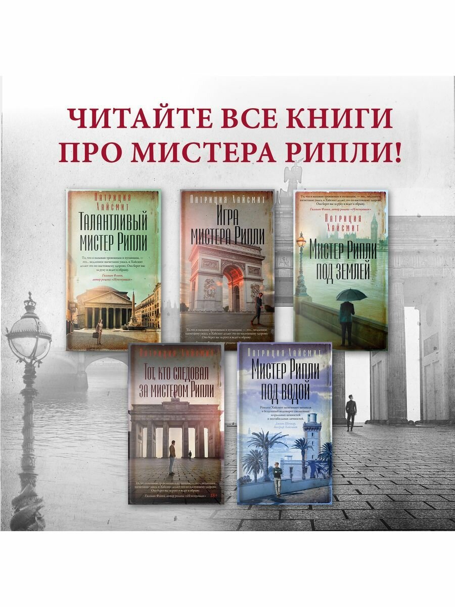 «Тот, кто следовал за мистером Рипли» — четвертый роман о самом известном персонаже американской писательницы Патриции Хайсмит, вовлекающей читателя в свой странный, замкнутый, иррациональный мир смещенных моральных ценностей и размытых границ между добром и злом. В мистере Рипли с трудом теперь можно узнать того нищего, без гроша в кармане, паренька с темным прошлым, который «не остановится ни перед чем». Читатель встречает Тома Рипли в его роскошном французском поместье, где тот наслаждается своими георгинами, игрой на клавесине и другими невинными радостями, а сбыту поддельных картин предпочитает продажу кистей и красок. Однако его спокойная жизнь меняется, когда Рипли знакомится с шестнадцатилетним американцем из очень богатой семьи, который сбежал из дому после загадочной смерти своего отца, магната пищевой промышленности. Рипли испытывает к подростку странное сочувствие, события стремительно развиваются, и вскоре эта неожиданная пара оказывается вовлечена в преступный мир Западного Берлина 1970-х годов…