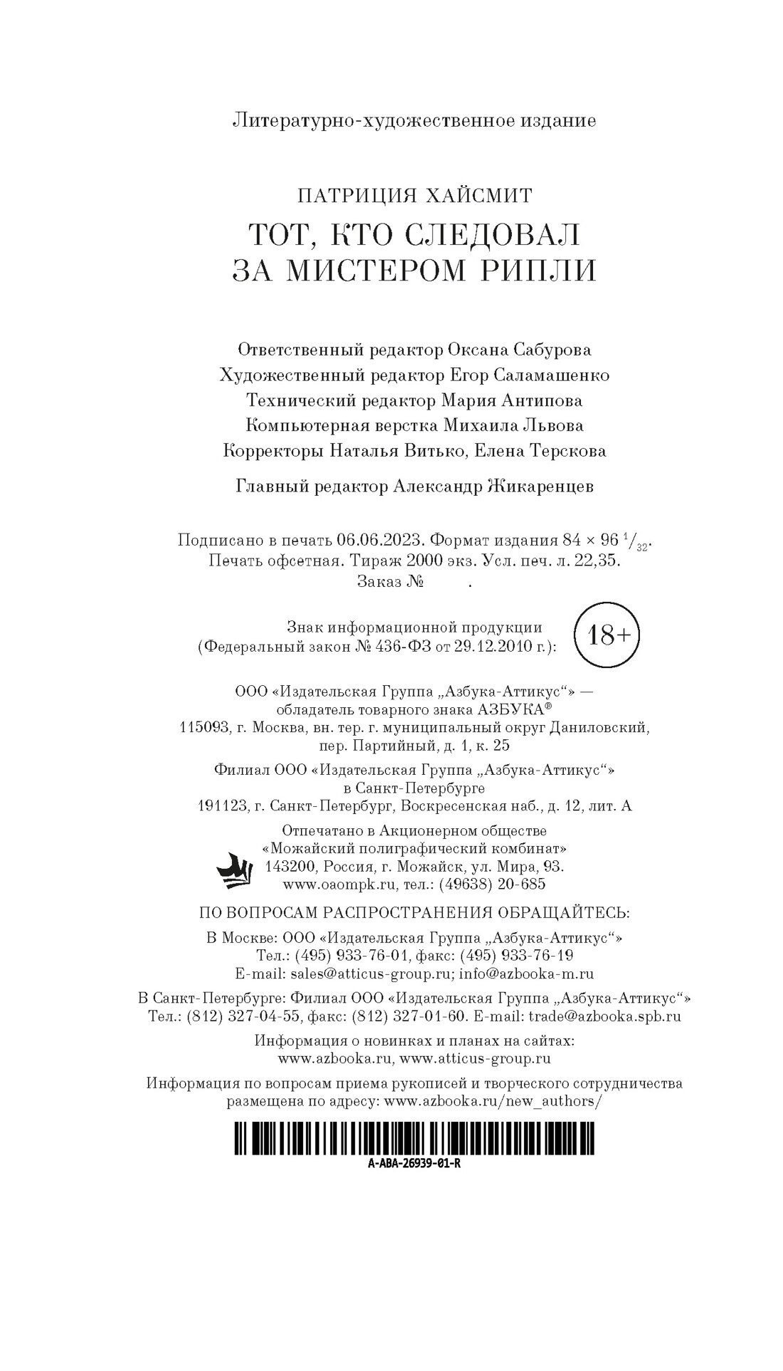 Тот кто следовал за мистером Рипли (Патриция Хайсмит); Азбука, 2023