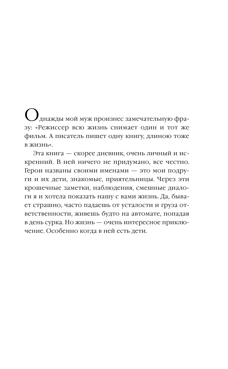 Когда вы будете читать эти зарисовки обычной жизни обычных людей — матери троих детей Кати, хозяйки салона красоты Карины и ее мужа Самвела, самой Маши и ее близких и друзей — эмоции у вас будут самые разные: от безудержного смеха до светлой грусти. Но главное — вы забудете о собственных проблемах и неурядицах и убедитесь в том, что жизнь разнообразна. И, пока мы живем, она продолжается.