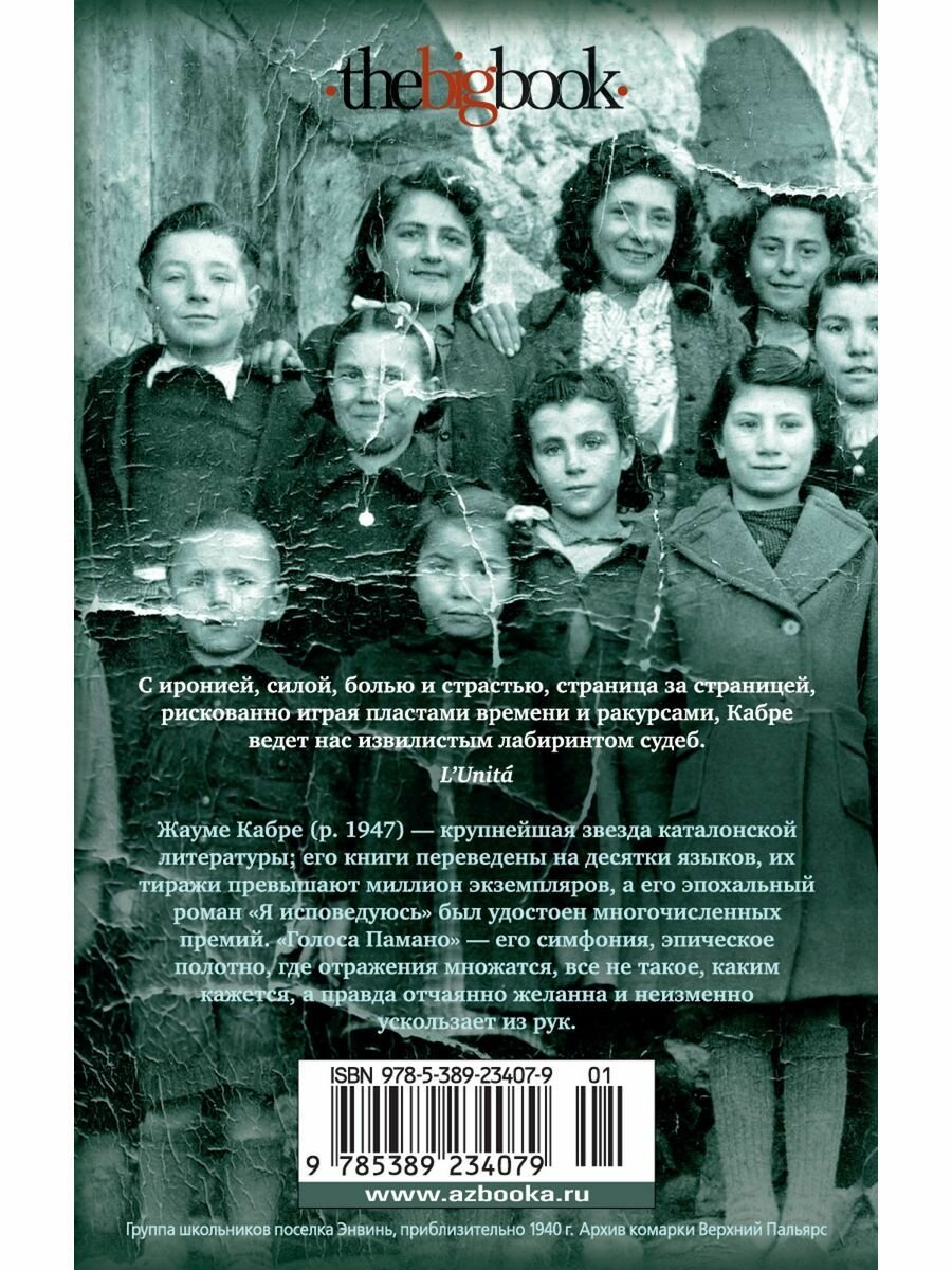 Жауме Кабре (р. 1947) — крупнейшая звезда каталонской литературы; его книги переведены на десятки языков, их тиражи превышают миллион экземпляров, а его эпохальный роман «Я исповедуюсь» был удостоен многочисленных премий. «Голоса Памано» — его симфония, эпическое полотно, где отражения множатся, все не такое, каким кажется, а правда отчаянно желанна и неизменно ускользает из рук.