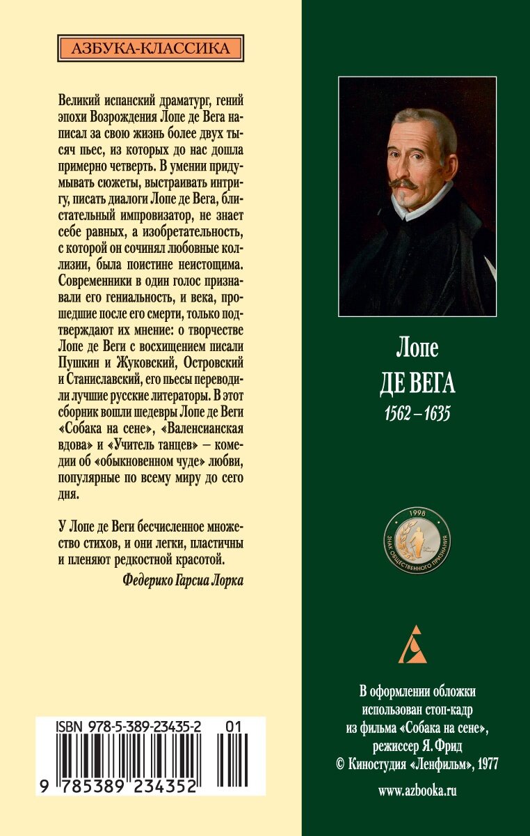 Великий испанский драматург, гений эпохи Возрождения Лопе де Вега написал за свою жизнь более двух тысяч пьес, из которых до нас дошла примерно четверть. В умении придумывать сюжеты, выстраивать интригу, писать диалоги Лопе де Вега, блистательный импровизатор, не знает себе равных, а изобретательность, с которой он сочинял любовные коллизии, была поистине неистощима. Современники в один голос признавали его гениальность, и века, прошедшие после его смерти, только подтверждают их мнение: о творчестве Лопе де Веги с восхищением писали Пушкин и Жуковский, Островский и Станиславский, его пьесы переводили лучшие русские литераторы. В этот сборник вошли шедевры Лопе де Веги «Собака на сене», «Валенсианская вдова» и «Учитель танцев» — комедии об «обыкновенном чуде» любви, популярные по всему миру до сего дня.