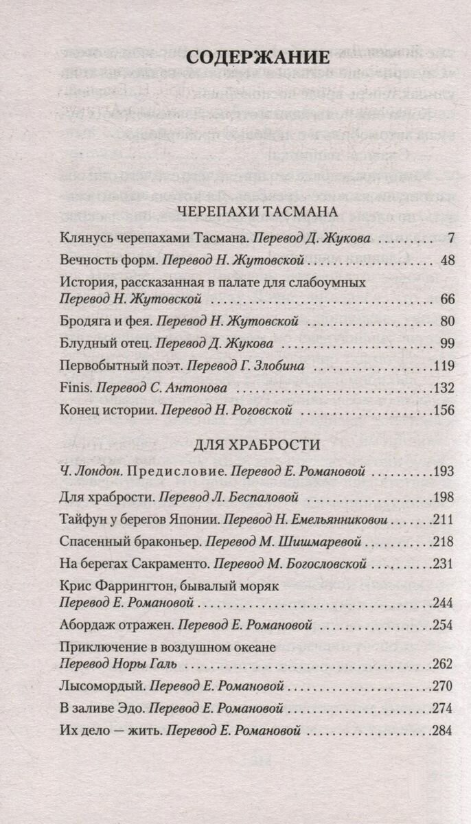 Джек Лондон, признанный классик американской и мировой литературы, известен прежде всего как автор приключенческих произведений. Его романы и повести об увлекательных и рискованных странствиях, о сильных, целеустремленных и благородных людях пользуются неизменным успехом у читателей. Но Джека Лондона по праву называют еще и одним из крупнейших мастеров короткого рассказа. В настоящее издание вошли два его авторских сборника. Объединенные в них рассказы были написаны уже в поздний период творчества. Сборник «Черепахи Тасмана» (1911) оказался последним прижизненным изданием Лондона, а сборник «Для храбрости» (1923) был подготовлен к печати Чармейн Лондон, вдовой писателя, — «в соответствии с его собственным намерением», как указала она в предисловии. Разнообразие сюжетов и тем, неожиданные и даже парадоксальные развязки, искренность и вера в человеческую природу – характерные черты Лондона-рассказчика, за которые миллионы читателей во всем мире любят его произведения.