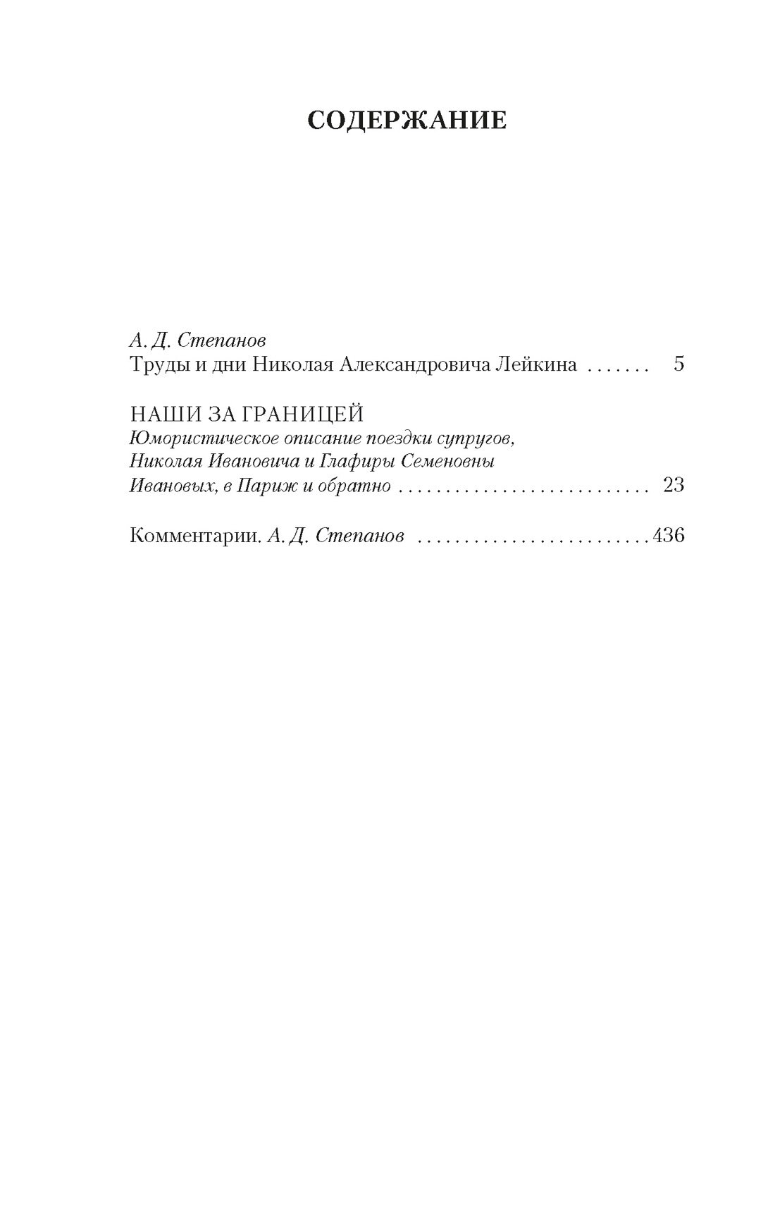 Книга "Наши за границей" - одно из самых известных произведений Лейкина, только при жизни автора книга выдержала 24 издания! Это веселое повествование о поездке купца Николая Ивановича Иванова и его жены Глафиры Семеновны во Францию - на знаменитую Всемирную выставку в Париже, для которой была построена Эйфелева башня. По дороге героев ждут забавные приключения и всевозможные недоразумения. Лейкинский мягкий юмор по отношению к соотечественникам, отправившимся мир посмотреть и себя показать, и сегодня не утратил актуальности.