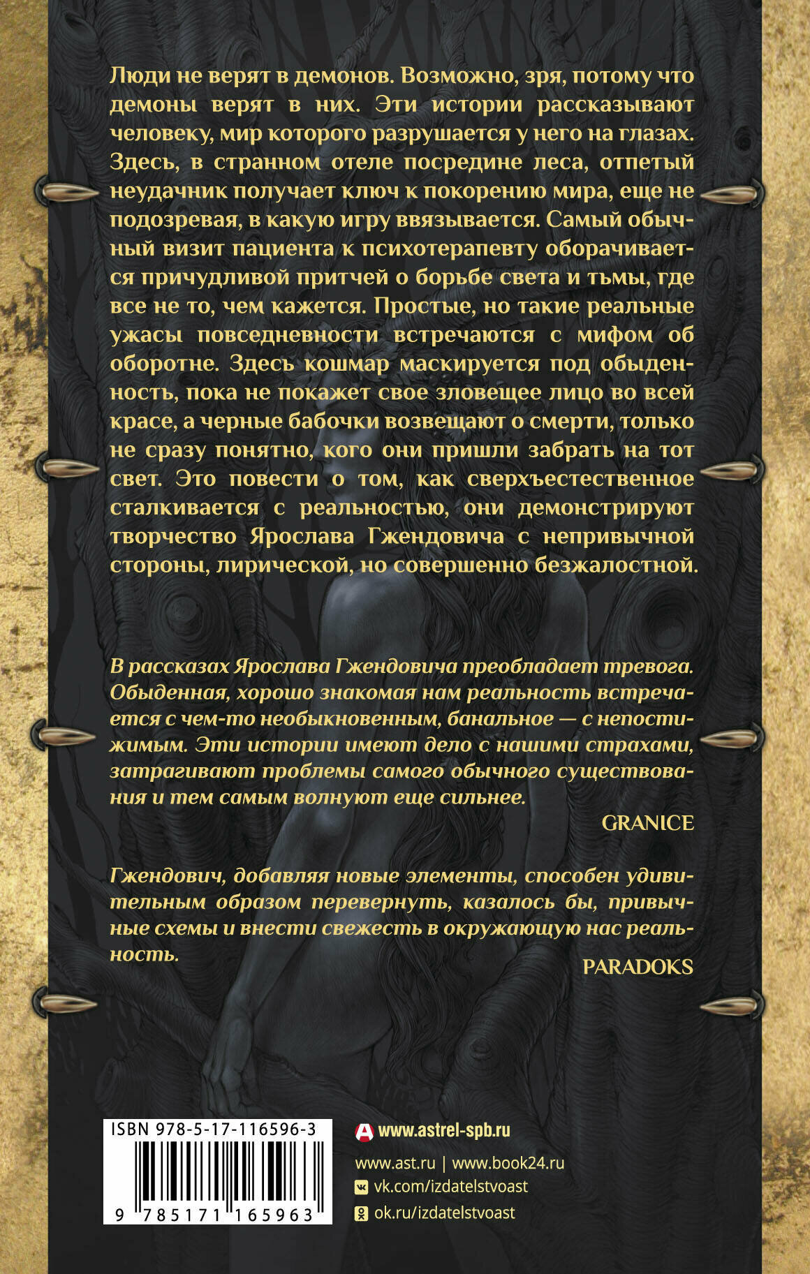 Люди не верят в демонов. Возможно, зря, потому что демоны верят в них. Эти истории рассказывают человеку, мир которого разрушается у него на глазах. Здесь, в странном отеле посредине леса, отпетый неудачник получает ключ к покорению мира, еще не подозревая, в какую игру ввязывается. Самый обычный визит пациента к психотерапевту оборачивается причудливой притчей о борьбе света и тьмы, где все не то, чем кажется. Простые, но такие реальные ужасы повседневности встречаются с мифом об оборотне. Здесь кошмар маскируется под обыденность, пока не покажет свое зловещее лицо во всей красе, а черные бабочки возвещают о смерти, только не сразу понятно, кого они пришли забрать на тот свет. Это повести о том, как сверхъестественное сталкивается с реальностью, они демонстрируют творчество Ярослава Гжендовича с непривычной стороны, лирической, но совершенно безжалостной.