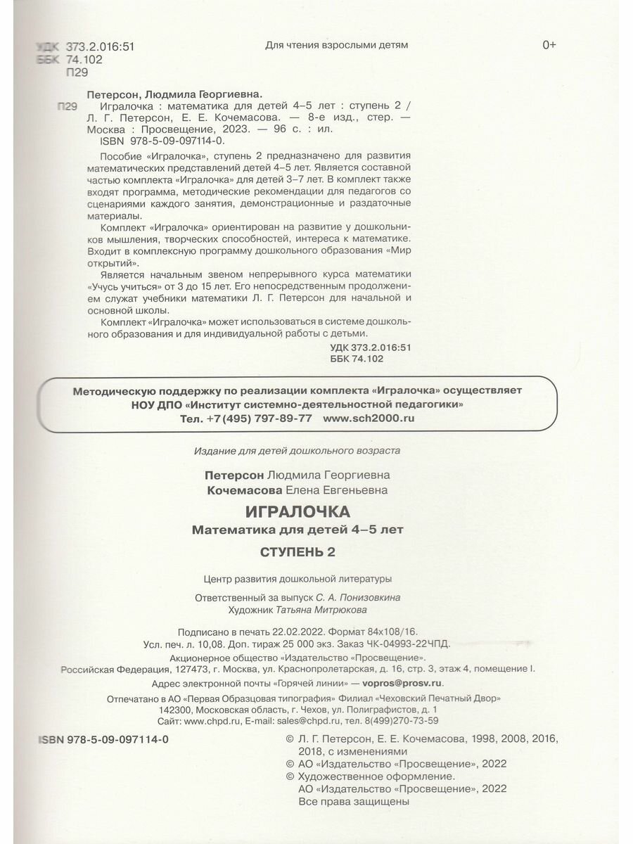 Игралочка. Математика для детей 4-5 лет. Ступень 2 (Кочемасова Елена Евгеньевна, Петерсон Людмила Георгиевна); Просвещение, 2022