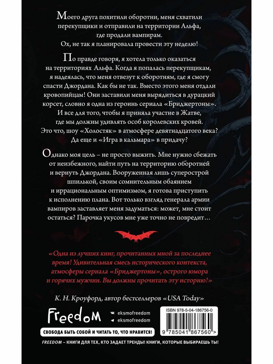 Моего друга похитили оборотни, меня схватили перекупщики и отправили на территории Альфа, где продали вампирам. Ох, не так я планировала провести эту неделю! По правде говоря, я планировала только оказаться на территории Альфа. Когда я попалась перекупщикам, я надеялась, что меня отвезут к оборотням, где я смогу спасти Джордана. Как бы не так. Вместо этого меня отдали кровопийцам! Они заставили меня вырядиться в дурацкий корсет, словно я одна из героинь сериала "Бриджертоны". И все для того, чтобы я приняла участие в Жатве, где мы должны удивлять особ королевских кровей. Это что, шоу "Холостяк" в атмосфере девятнадцатого века? Да еще и "Игра в кальмара" в придачу? Однако моя цель – не просто выжить. Мне нужно сбежать от неизбежного, найти путь на территорию оборотней и вернуть Джордана. Вооруженная лишь суперострой шпилькой, своим сомнительным обаянием и иррациональным оптимизмом, я готова приступить к исполнению плана. Вот только взгляд генерала армии вампиров заставляет меня задуматься: может мне стоит остаться? Парочка укусов мне уже точно не повредит…