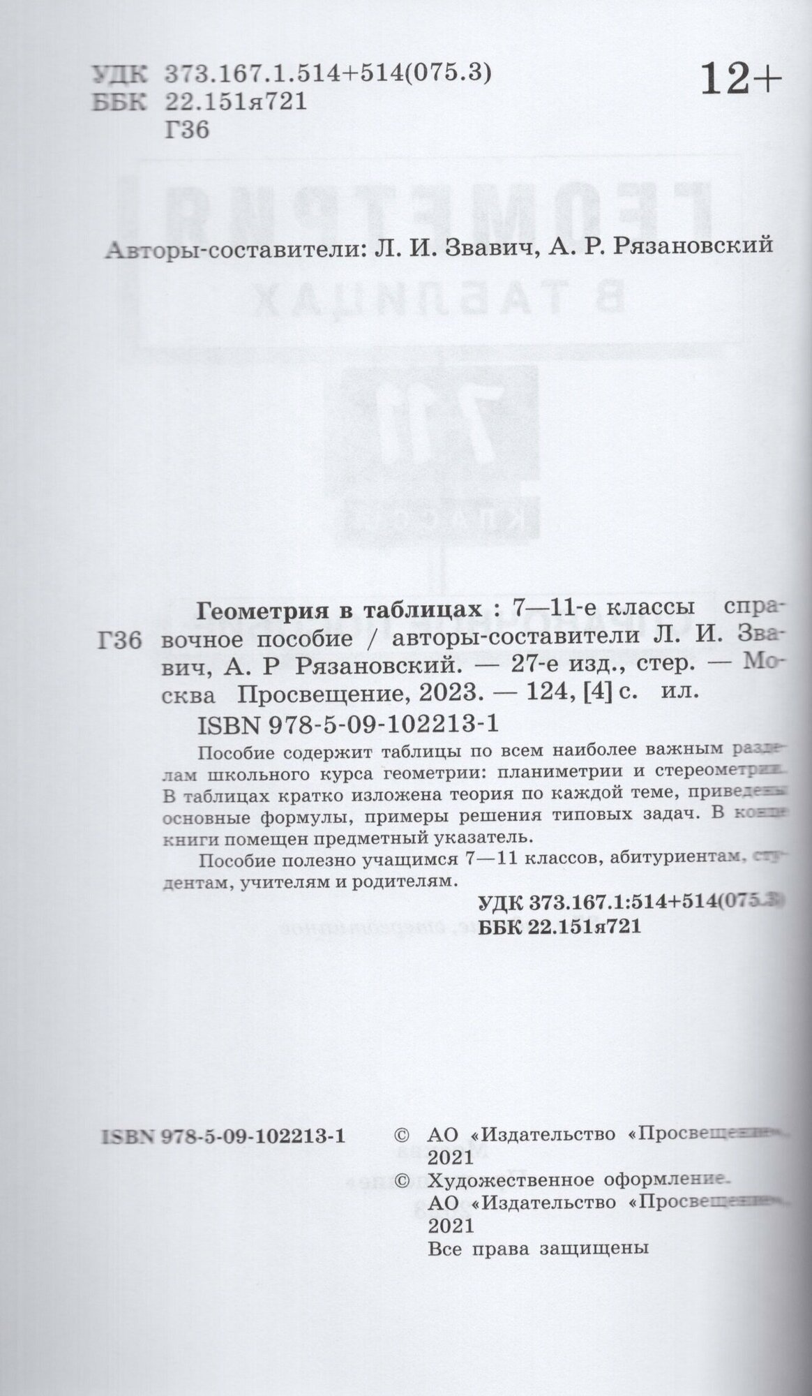 Геометрия в таблицах. 7-11 классы. Справочное пособие (Леонид Исаакович Звавич, Андрей Рафаилович Рязановский); Просвещение, 2025