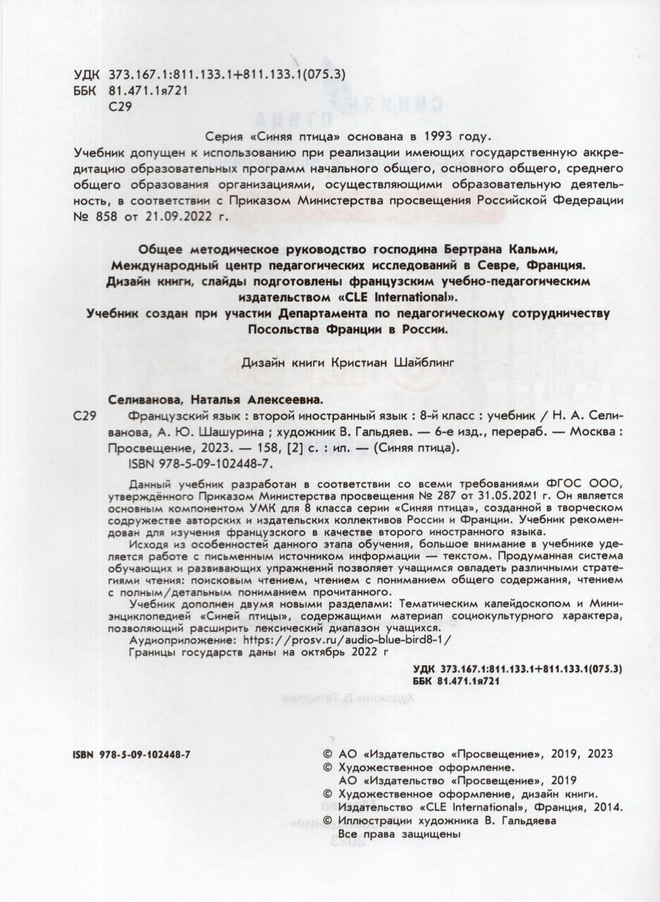Французский язык. Второй иностранный язык. 8 класс. Учебник /Loiseau bleu/ (Селиванова Наталья Алексеевна, Шашурина Алла Юрьевна); Просвещение, 2023