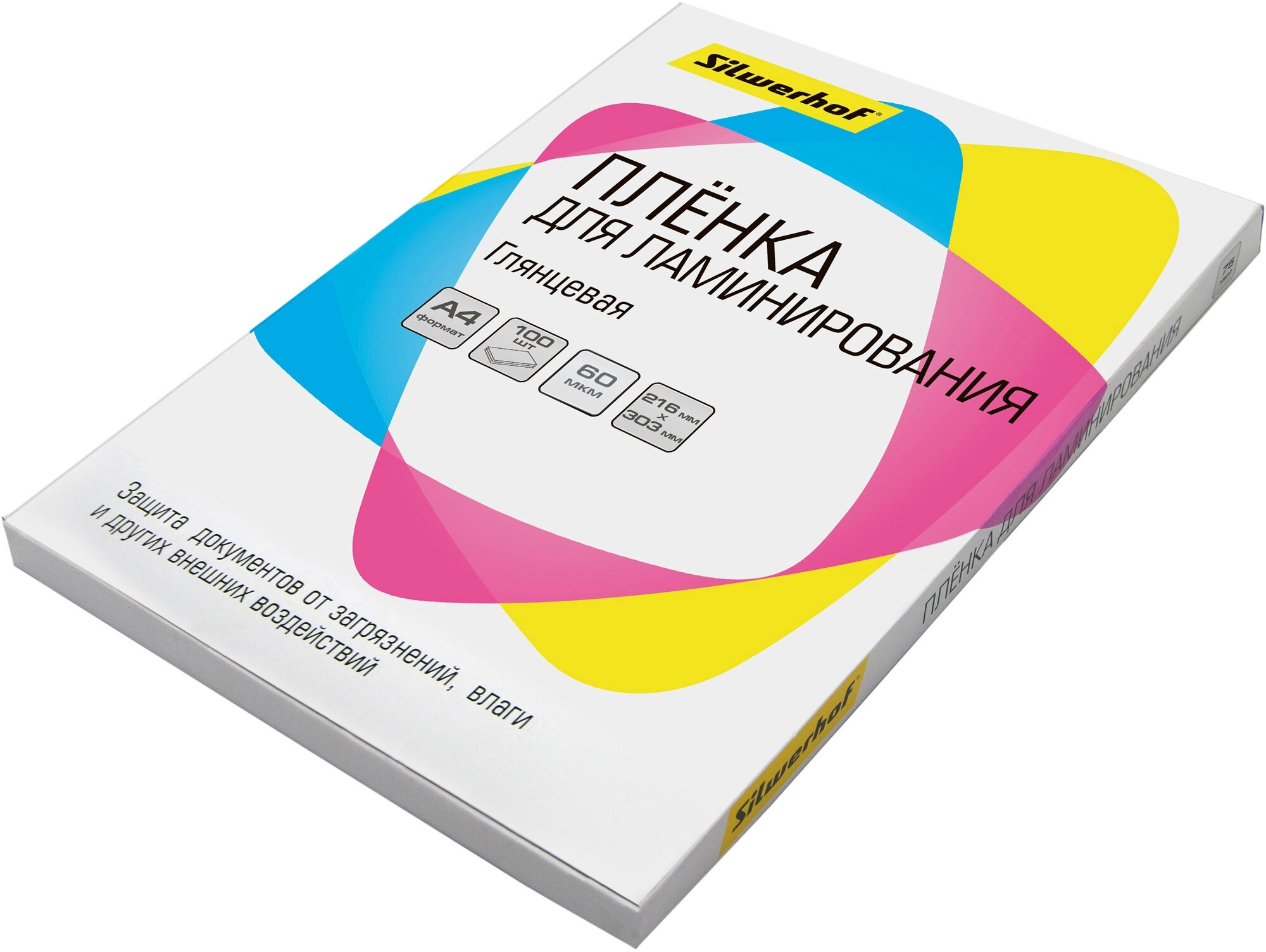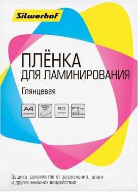 Пленка для ламинирования Silwerhof, A4, 60мкм, 100шт., глянцевая поверхность, 216x303мм