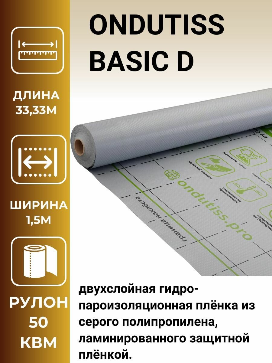 **Ветровлагозащитная мембрана Ондутис Бейсик Д** - двухслойный строительный материал. Предназначен для защиты неутепленных кровель с металлическими или иными покрытиями. Также применяется для перекрытия полов в помещениях с высоким уровнем влажности, пароизоляции зданий. Снижает риск появления наледи и сосулек при отводе тепловых потоков от кровли.