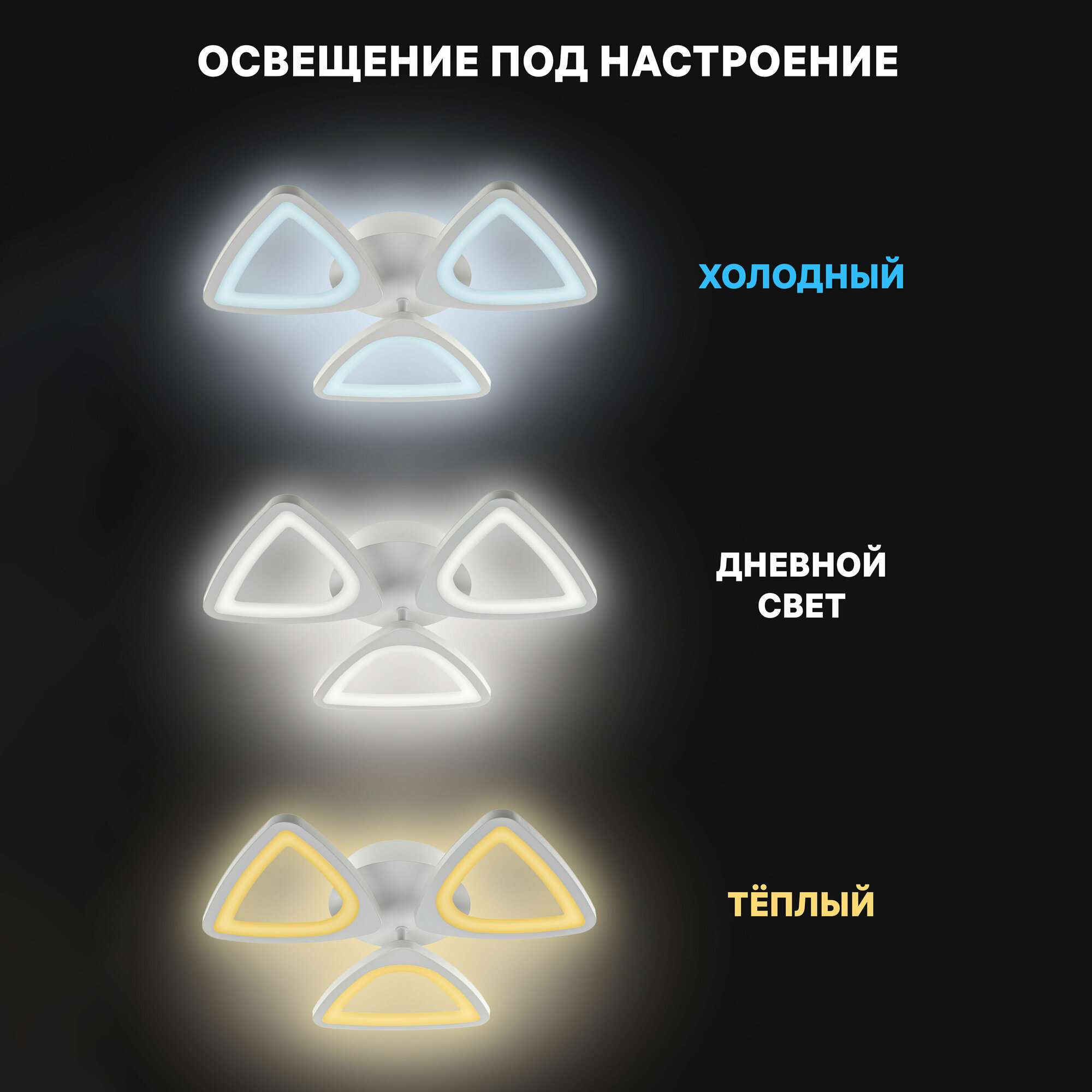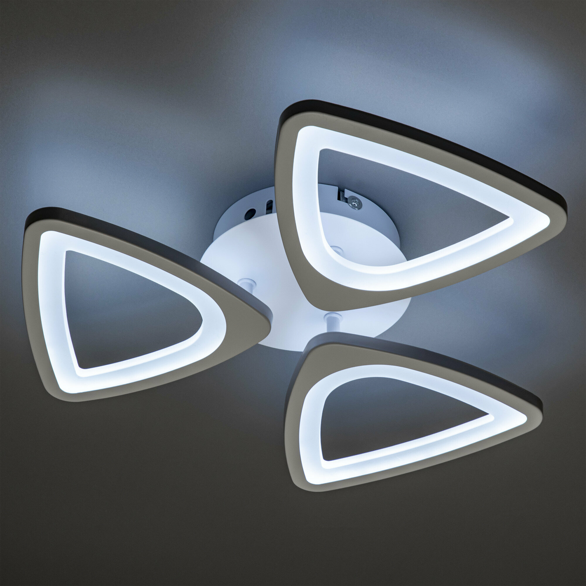 **Люстра потолочная светодиодная «Viento»** может крепиться к низкому и натяжному потолкам при помощи планки. Выполнена в виде светящихся треугольников. Для управления используется настенный выключатель. Подходит для эксплуатации в качестве ночника.